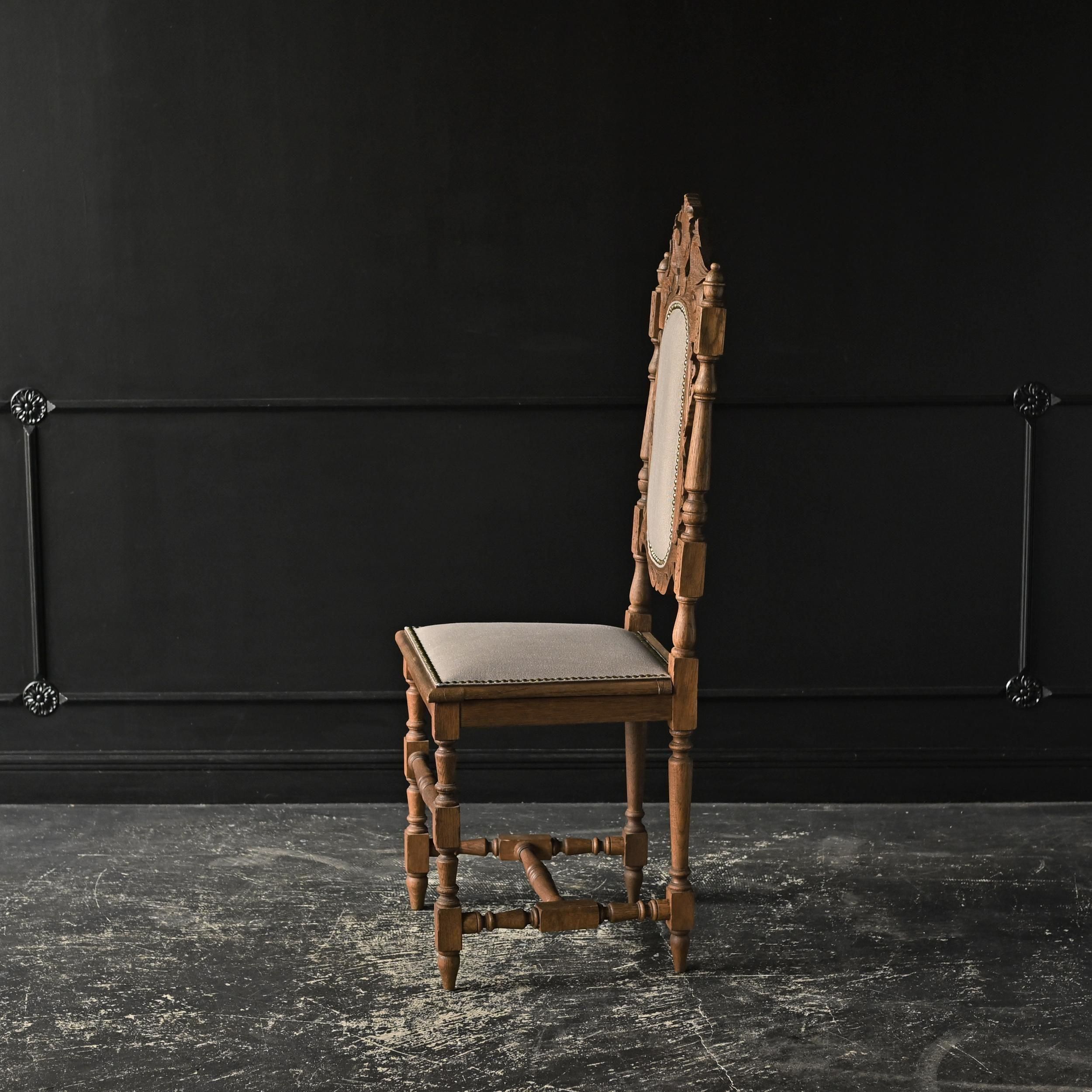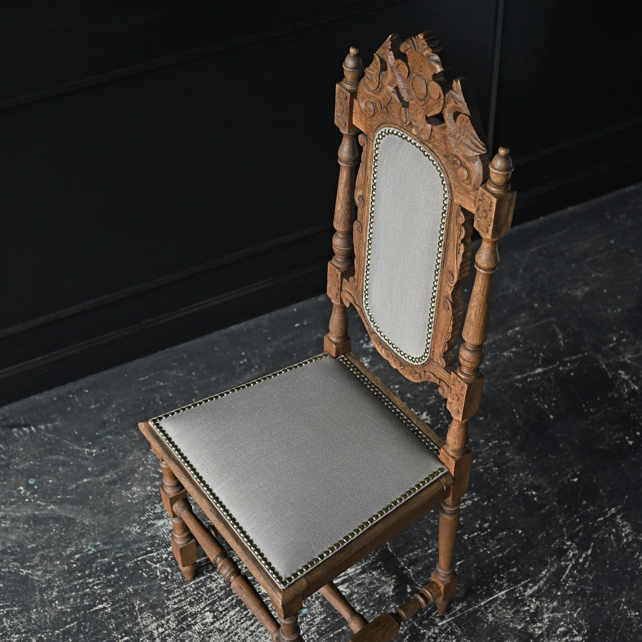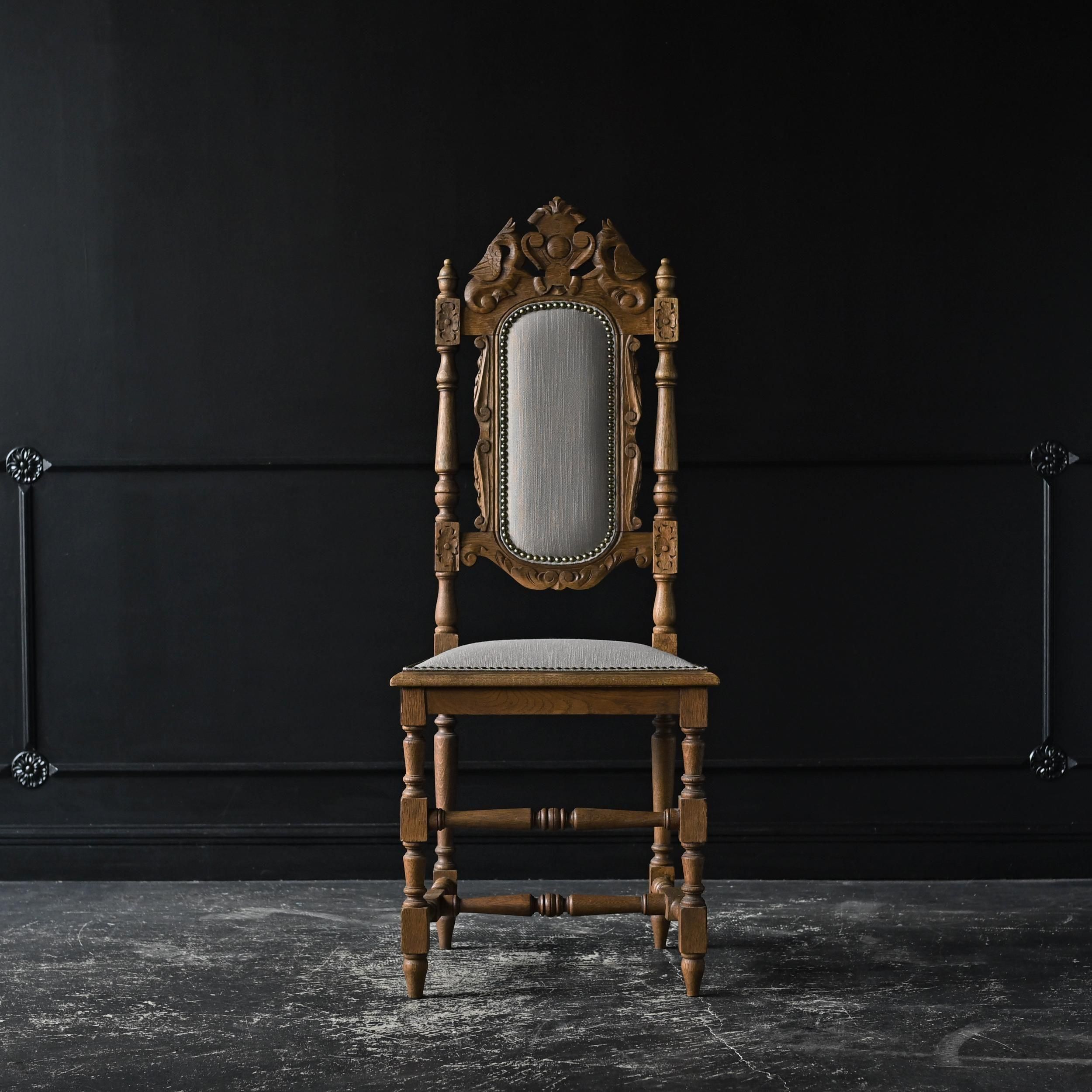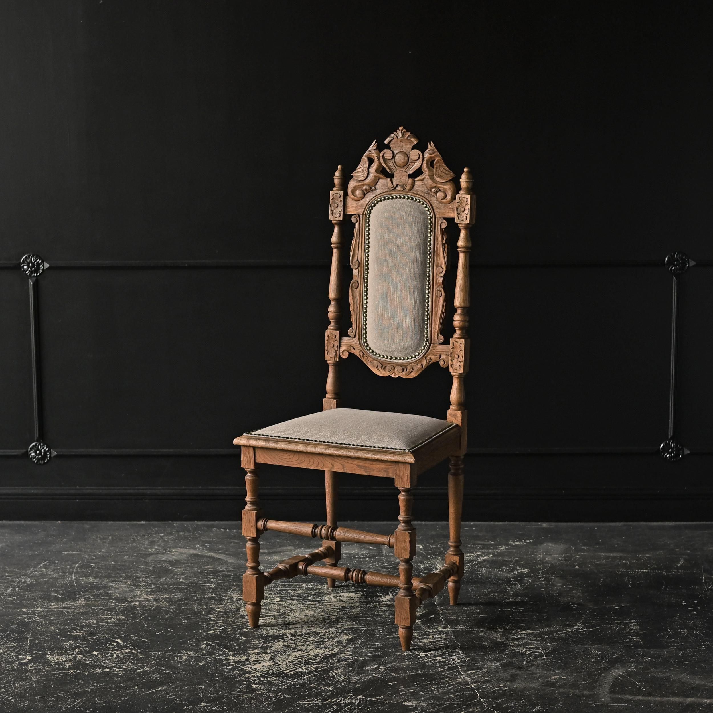 背もたれ上部には植物や紋章をモチーフにした繊細な彫刻が施され、重厚でクラシカルな佇まいが魅力。