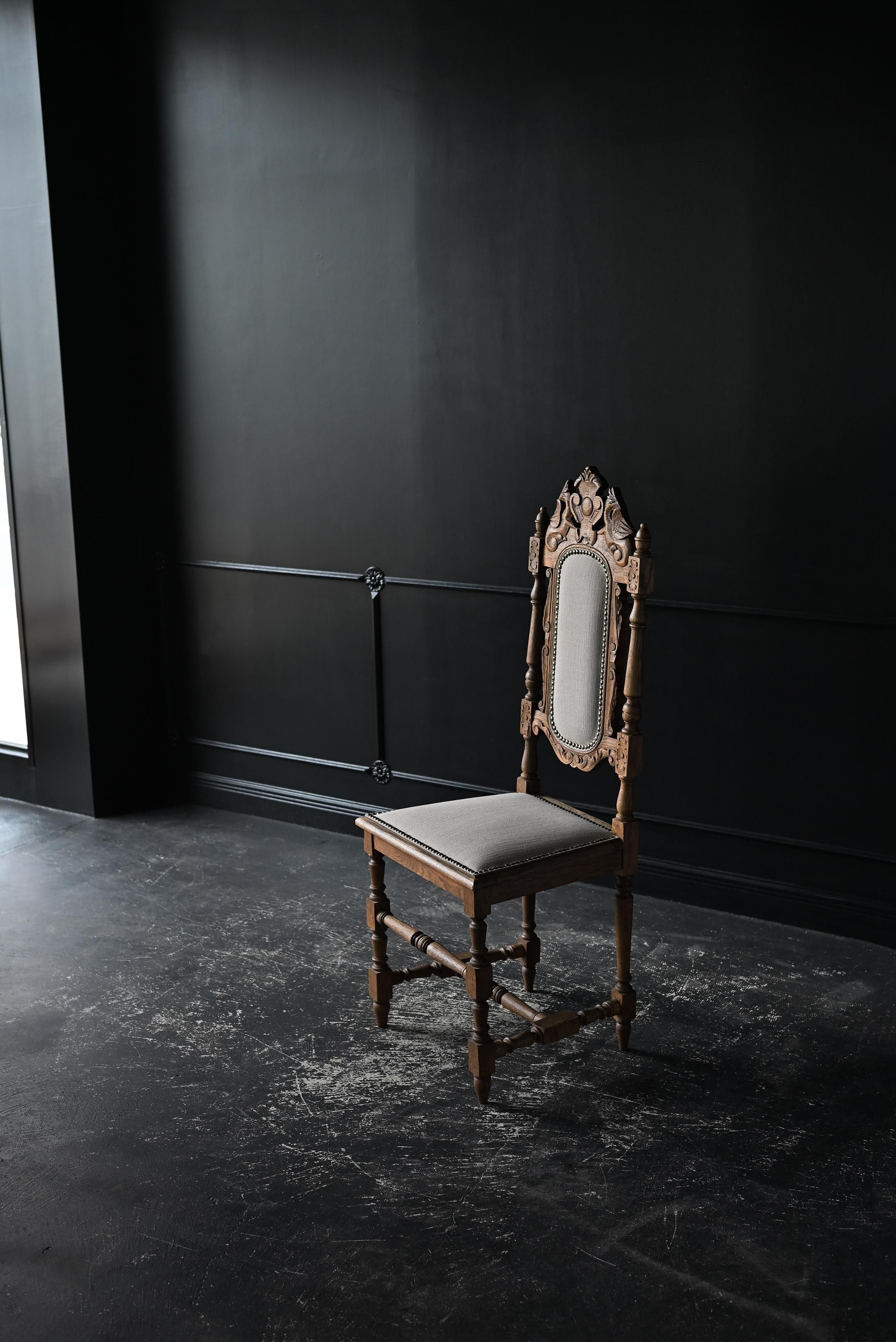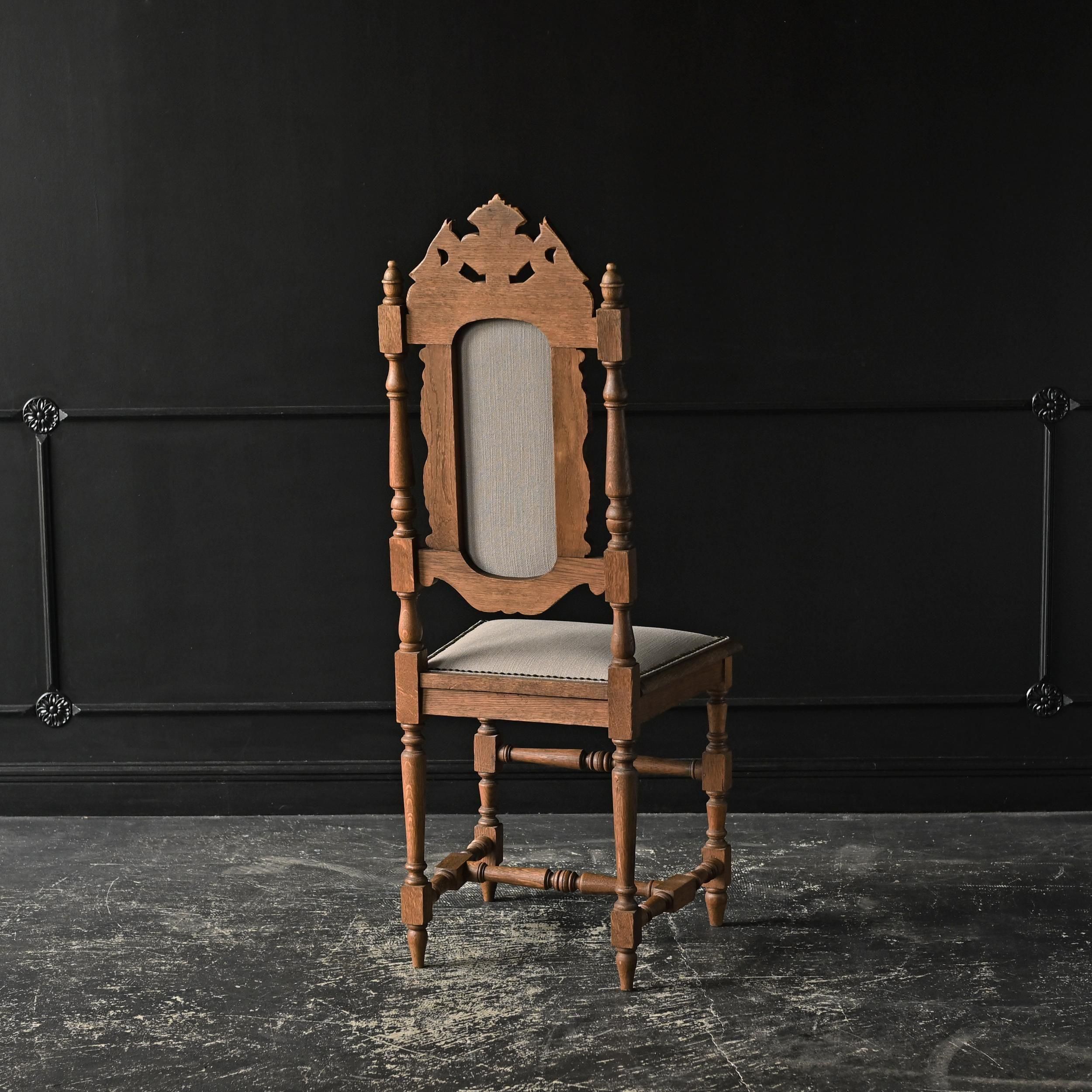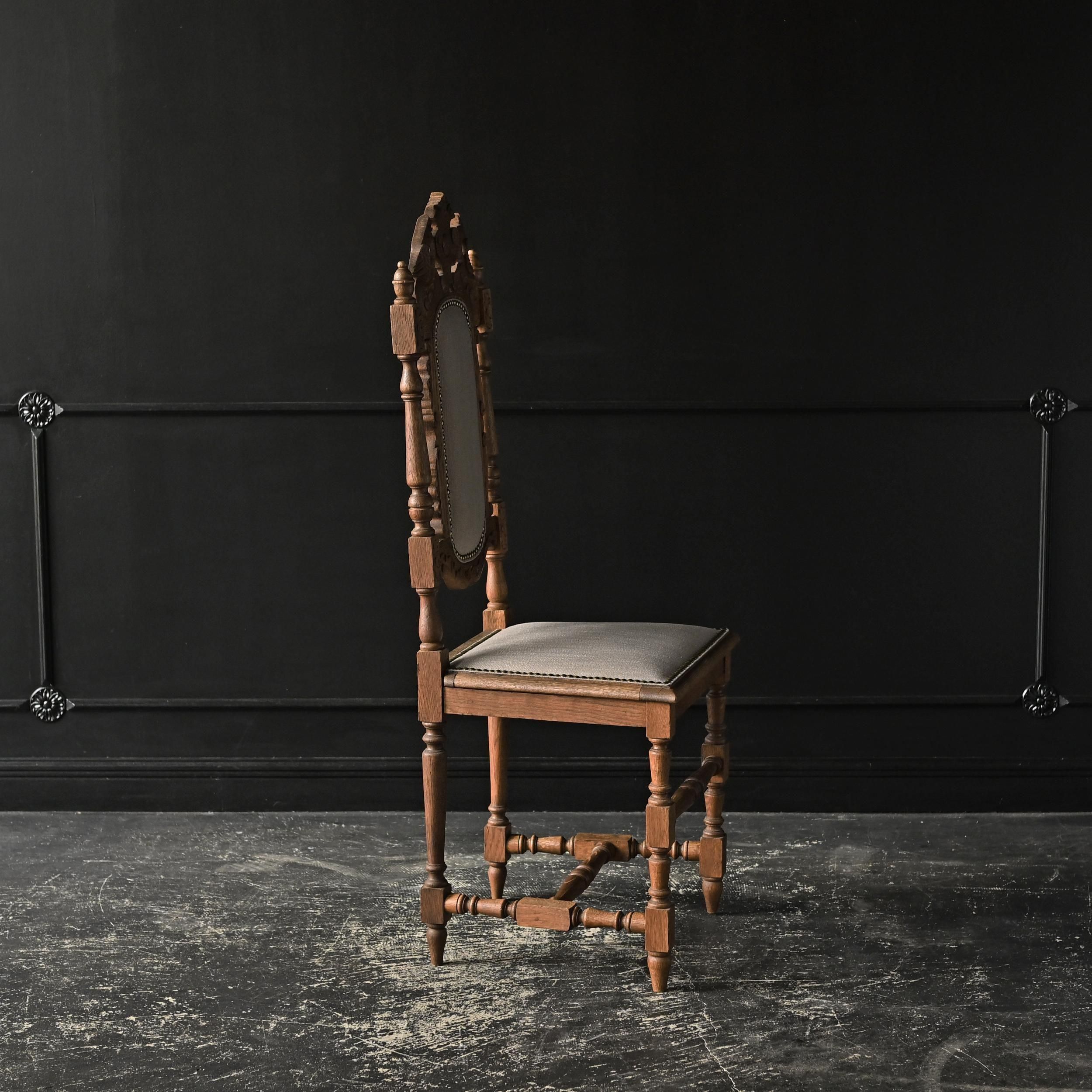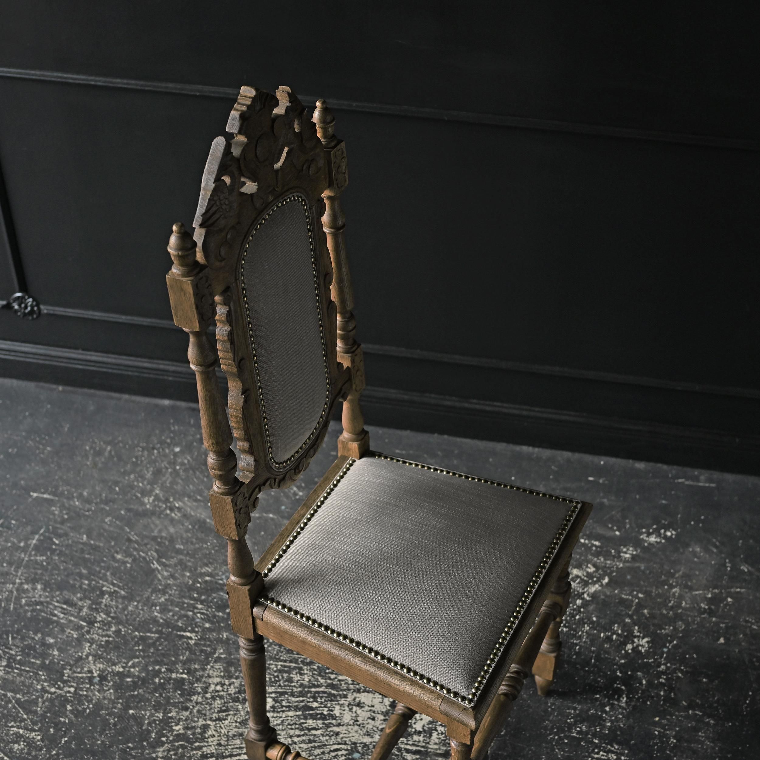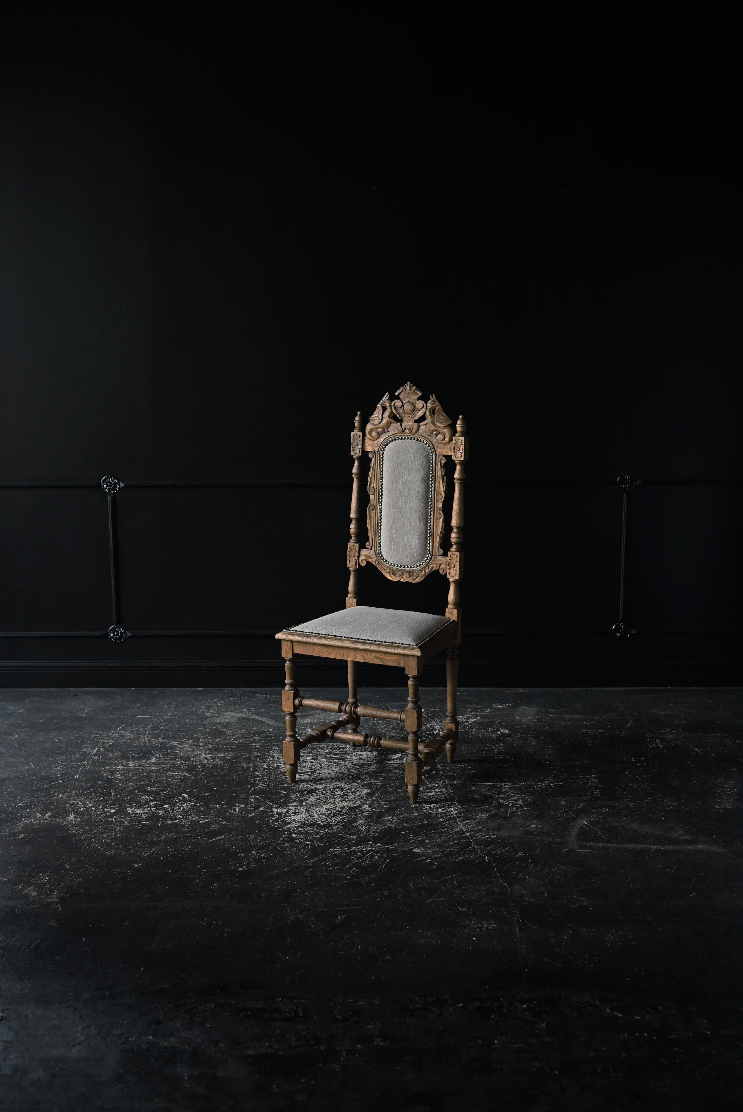背もたれ上部には植物や紋章をモチーフにした繊細な彫刻が施され、重厚でクラシカルな佇まいが魅力。