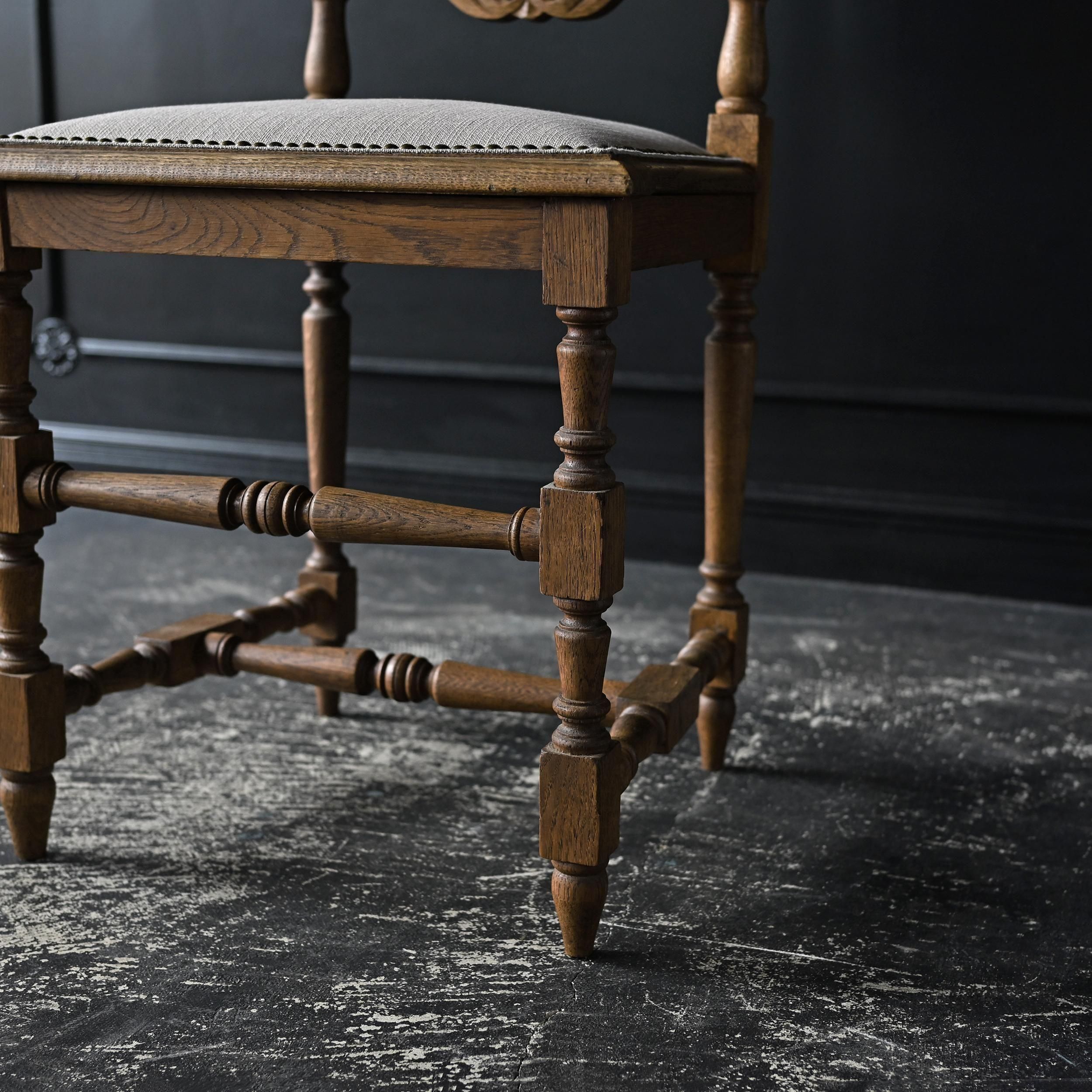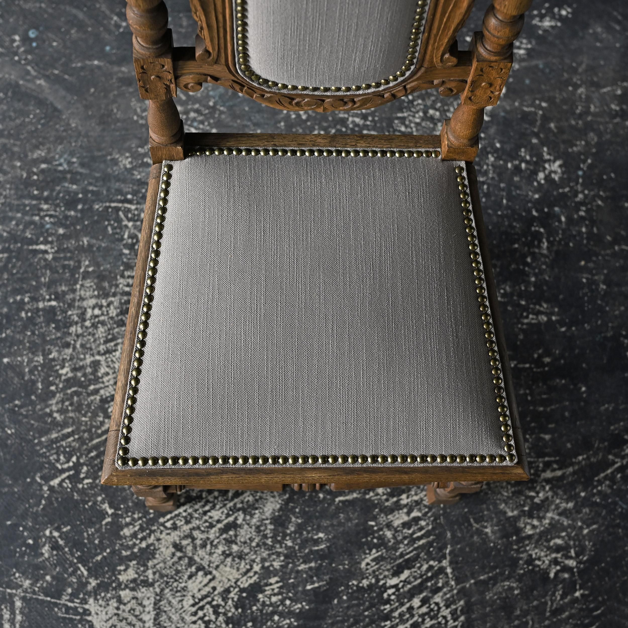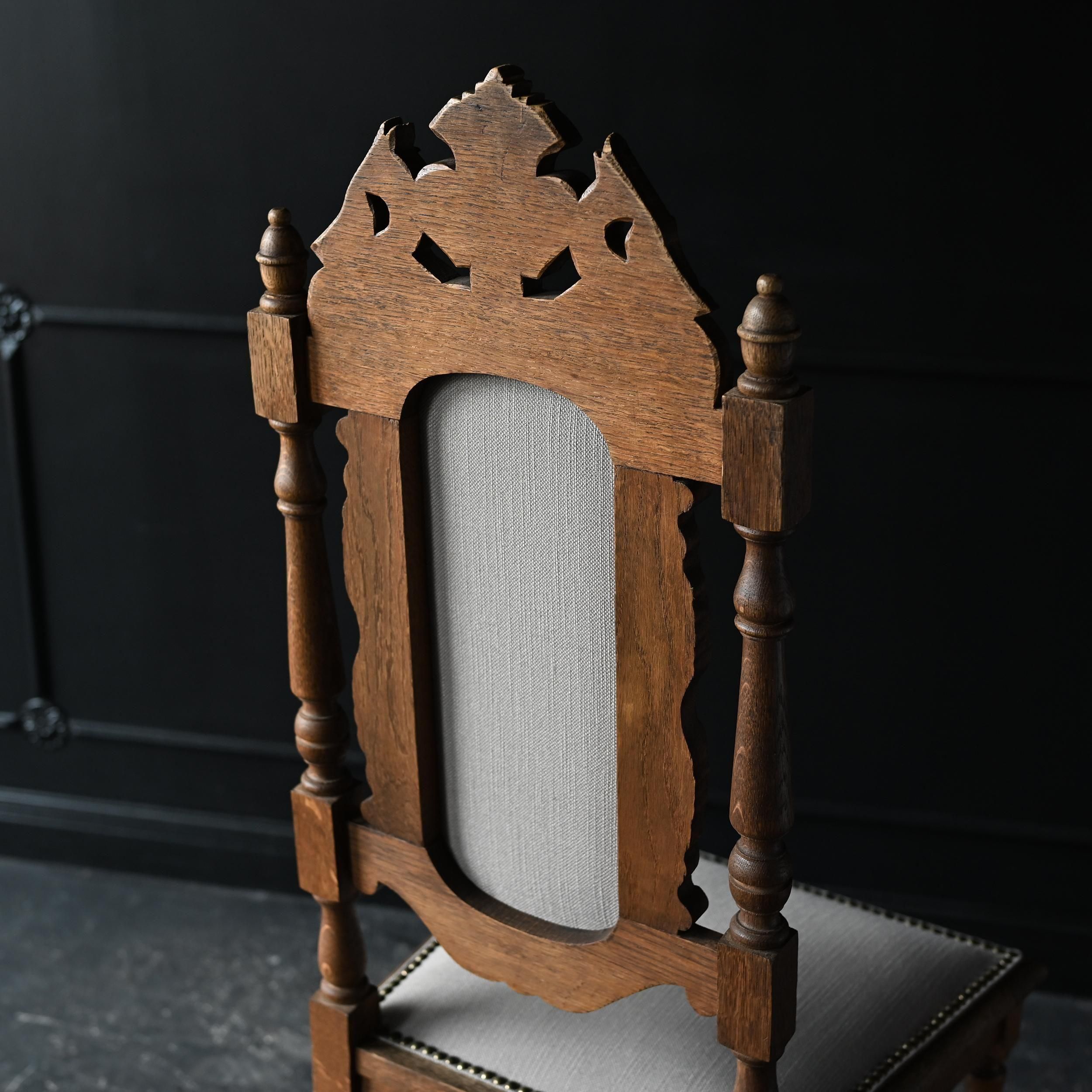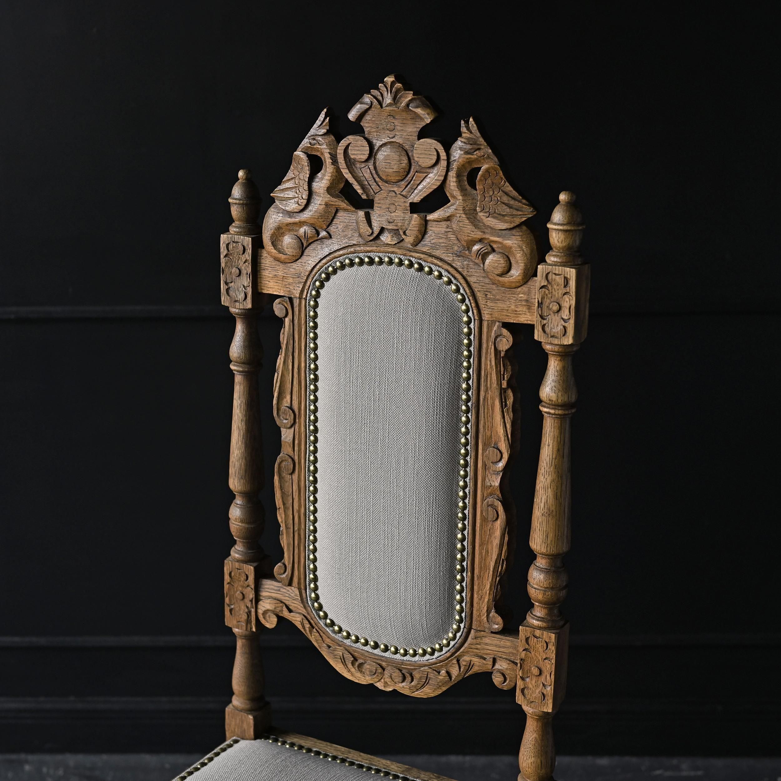 背もたれ上部には植物や紋章をモチーフにした繊細な彫刻が施され、重厚でクラシカルな佇まいが魅力。