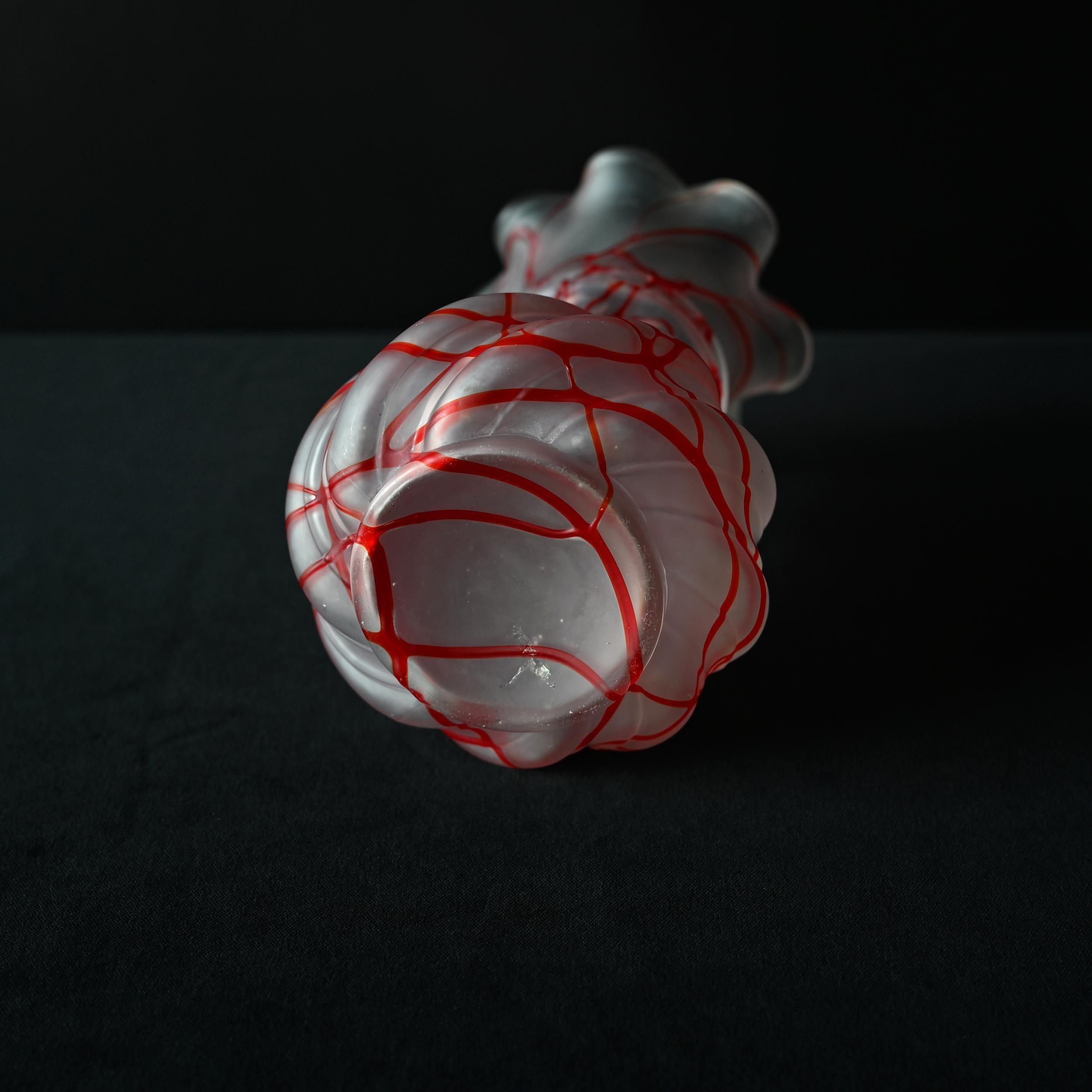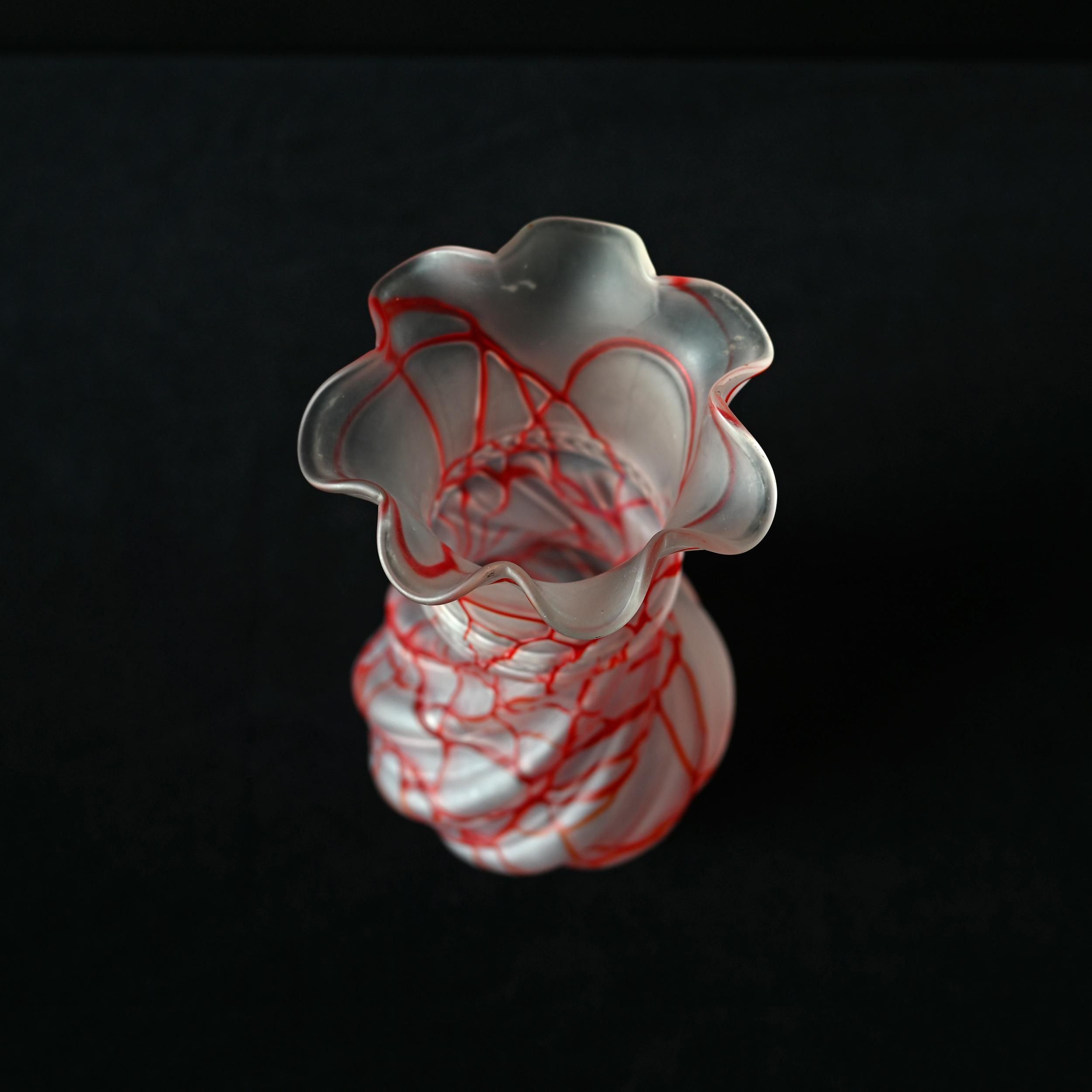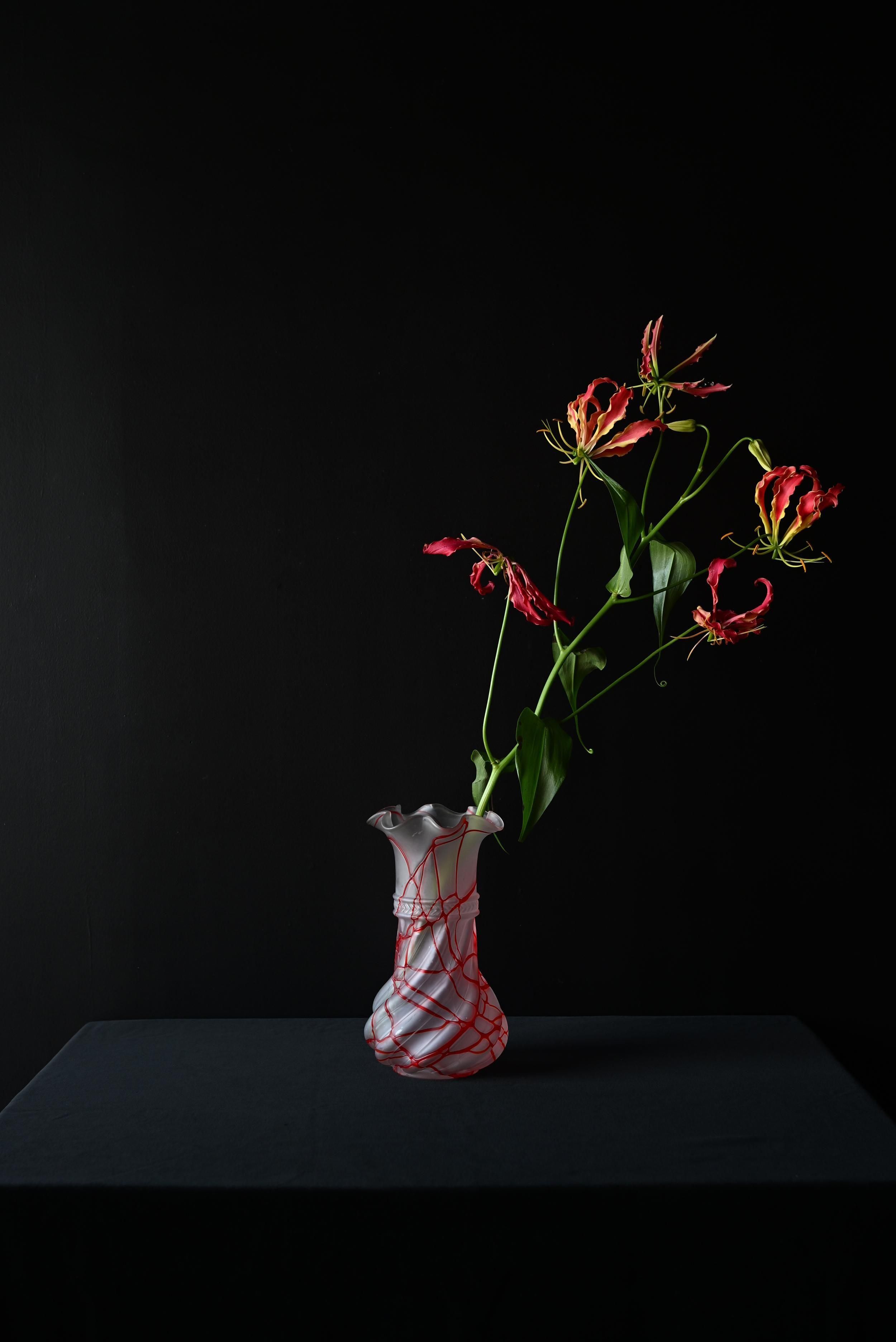 マットな乳白色のガラスに鮮やかな赤が絡み合い、芸術作品のような存在感を放ちます。