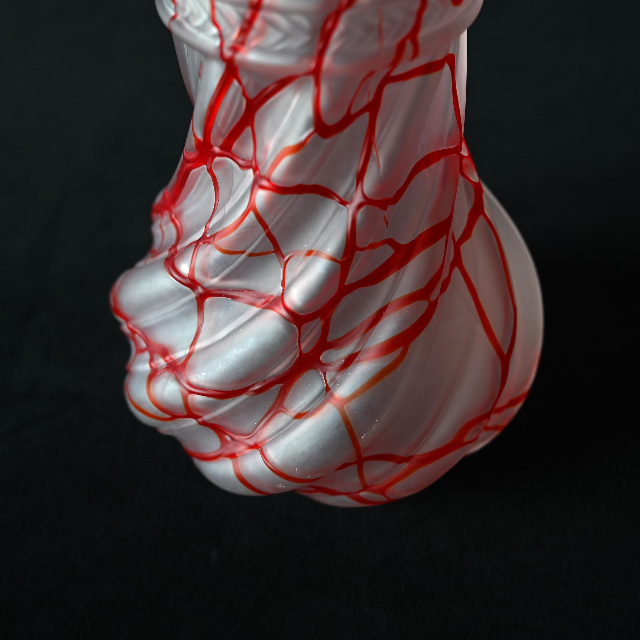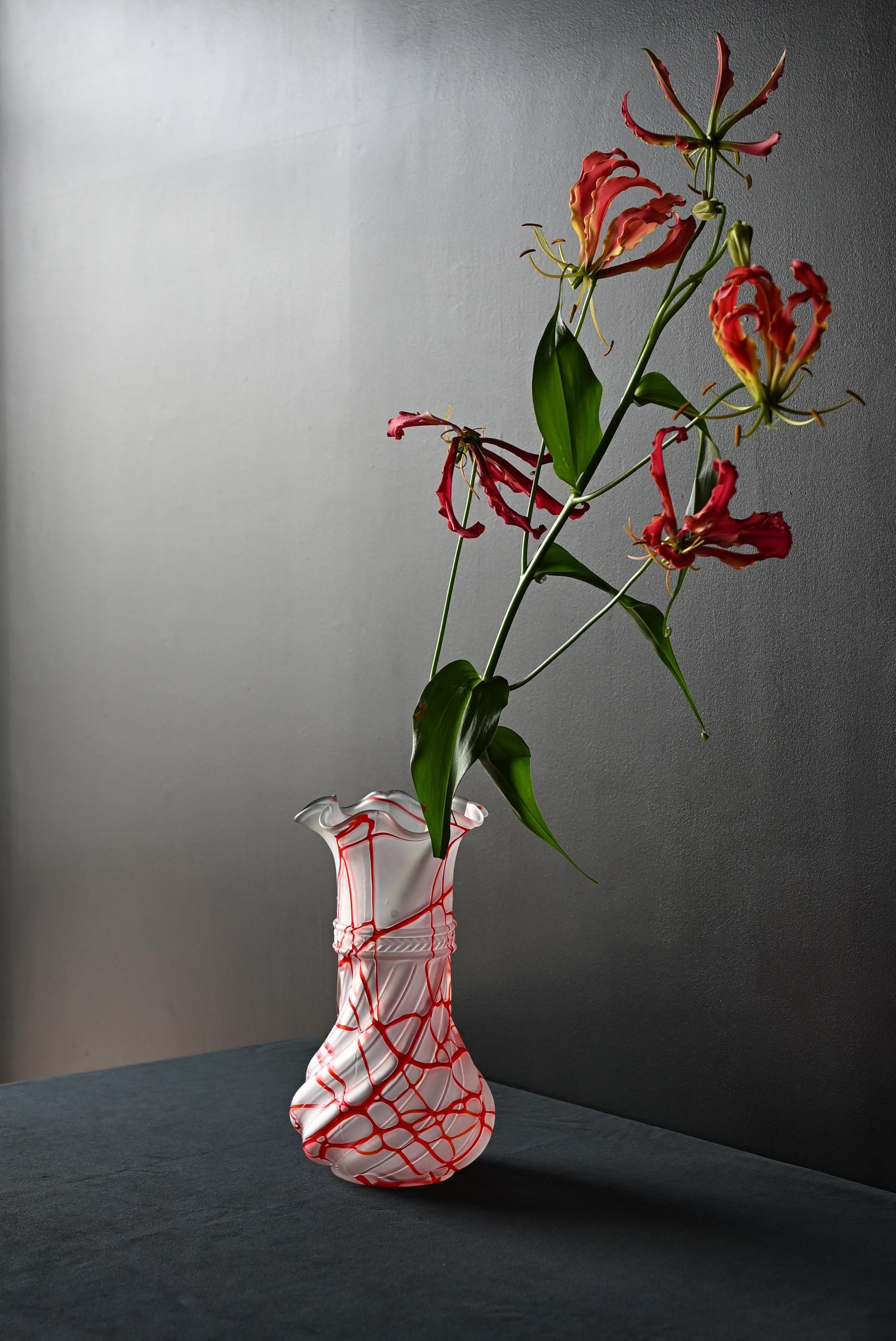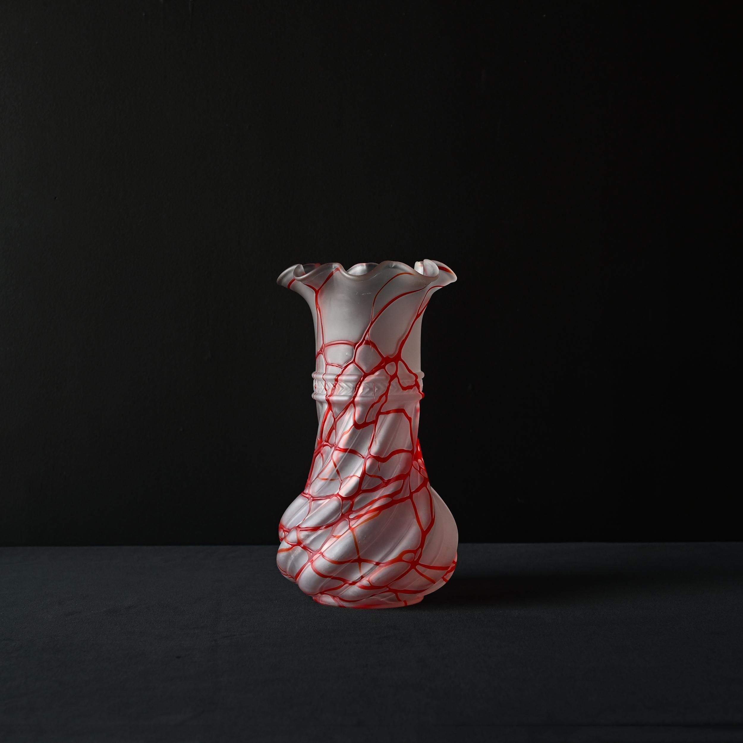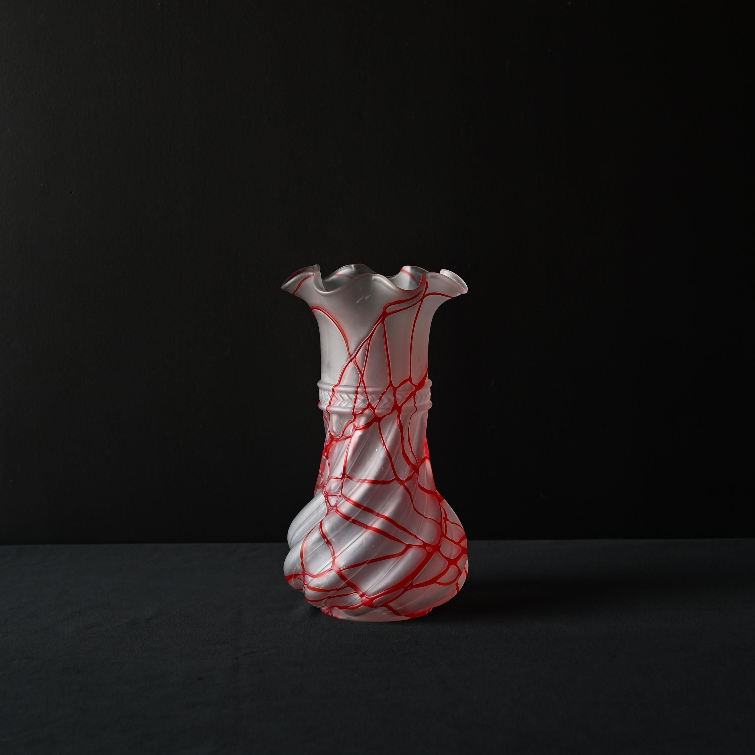 マットな乳白色のガラスに鮮やかな赤が絡み合い、芸術作品のような存在感を放ちます。