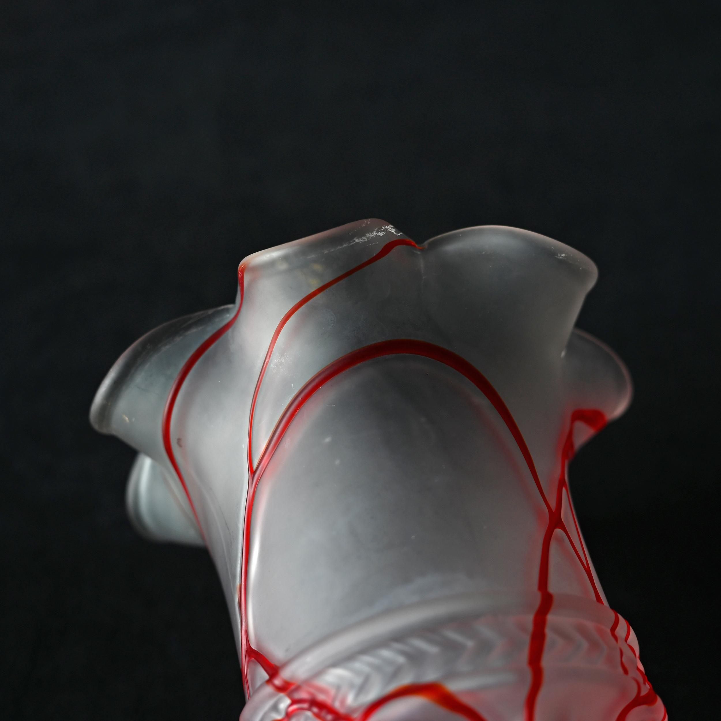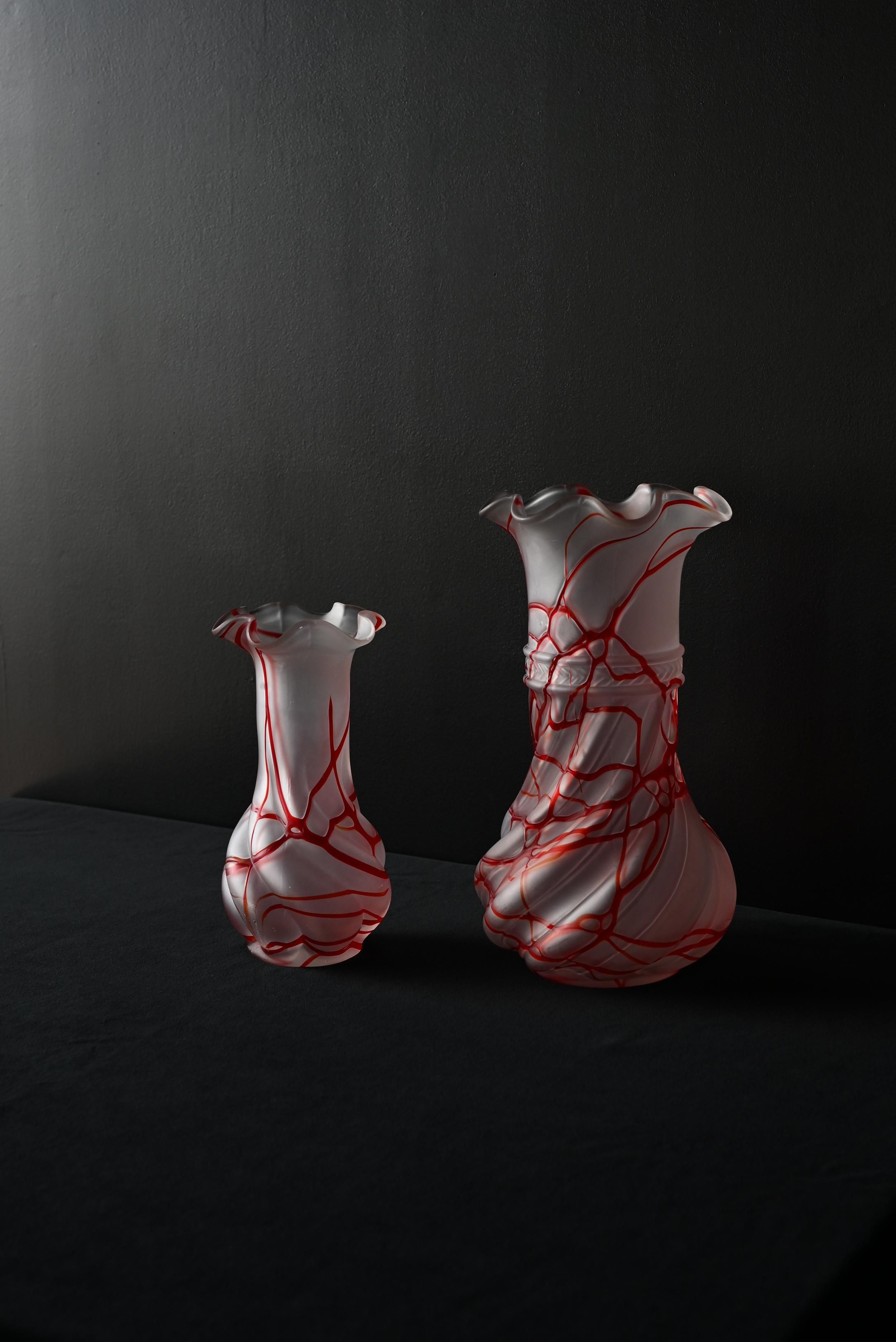 アール・ヌーヴォー期を思わせる、美しい曲線と赤の流れるような模様が印象的なガラス花瓶のペアです。