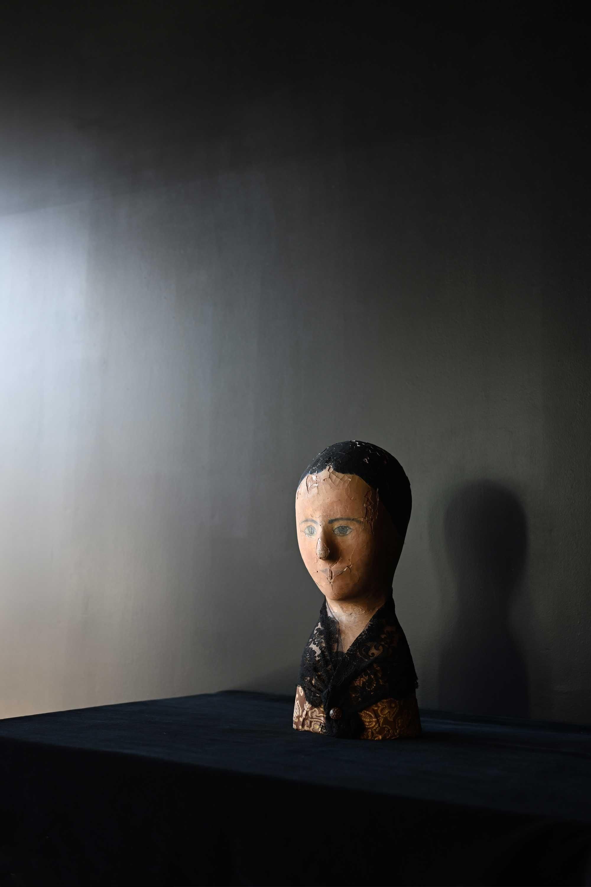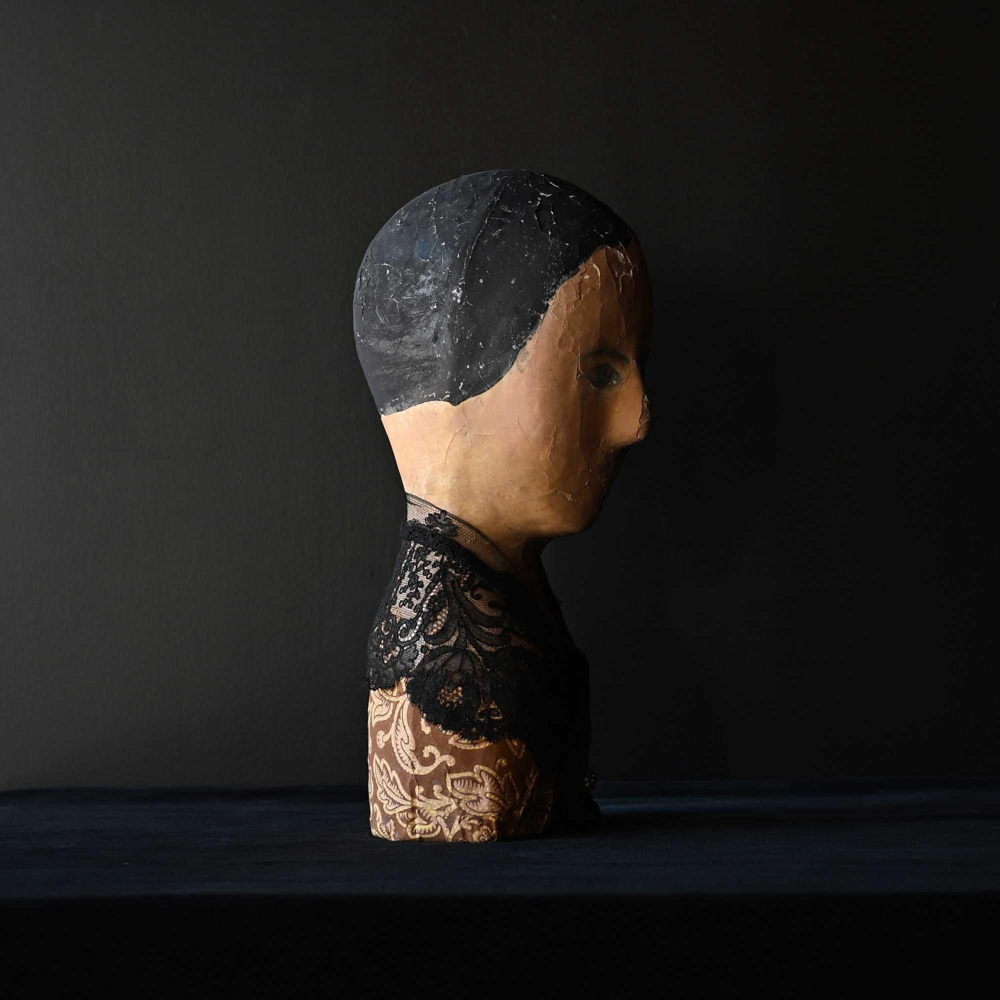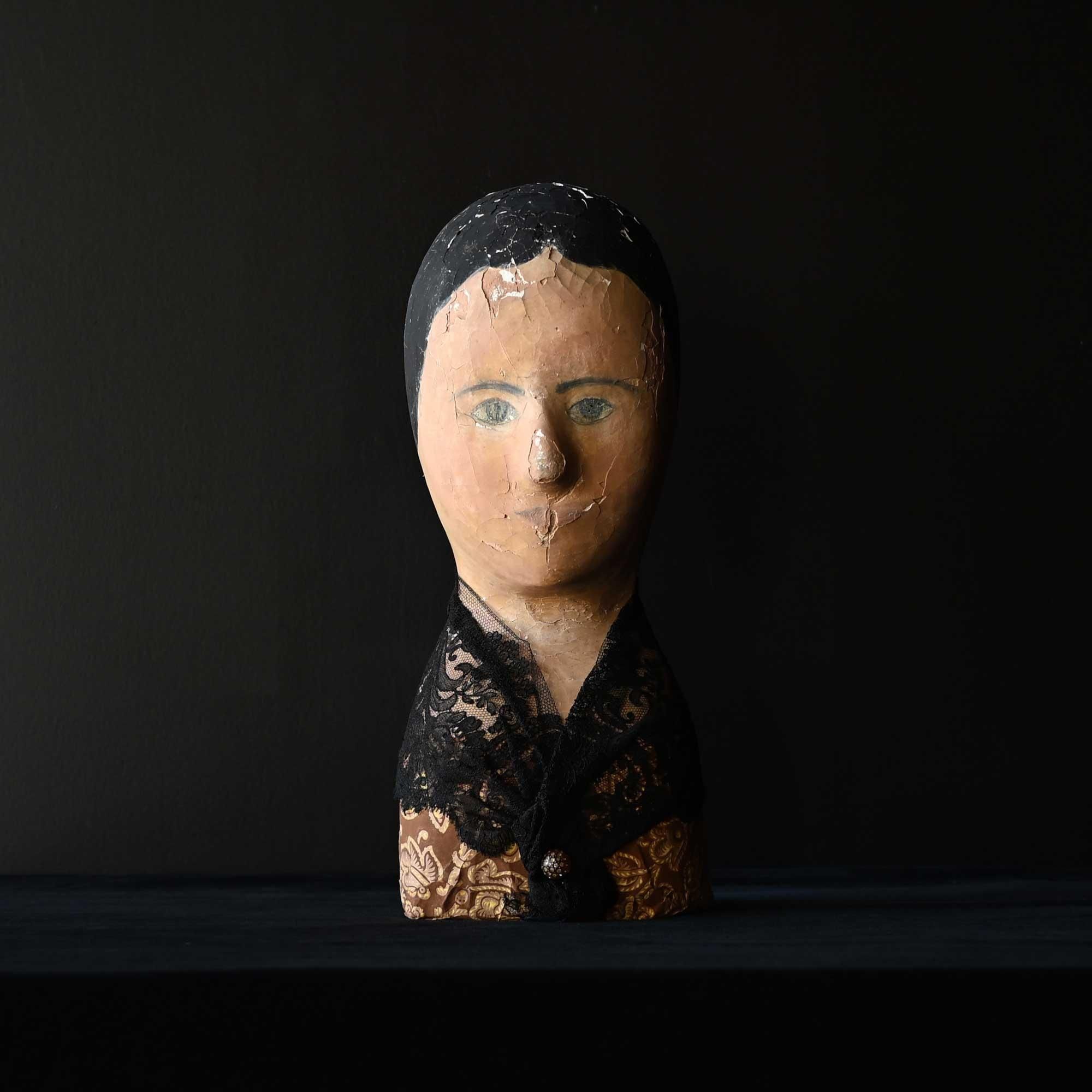首元にはレースや布があしらわれ、長い年月を経て深みを増した表情と相まって、まるで小さな肖像彫刻のような趣き。