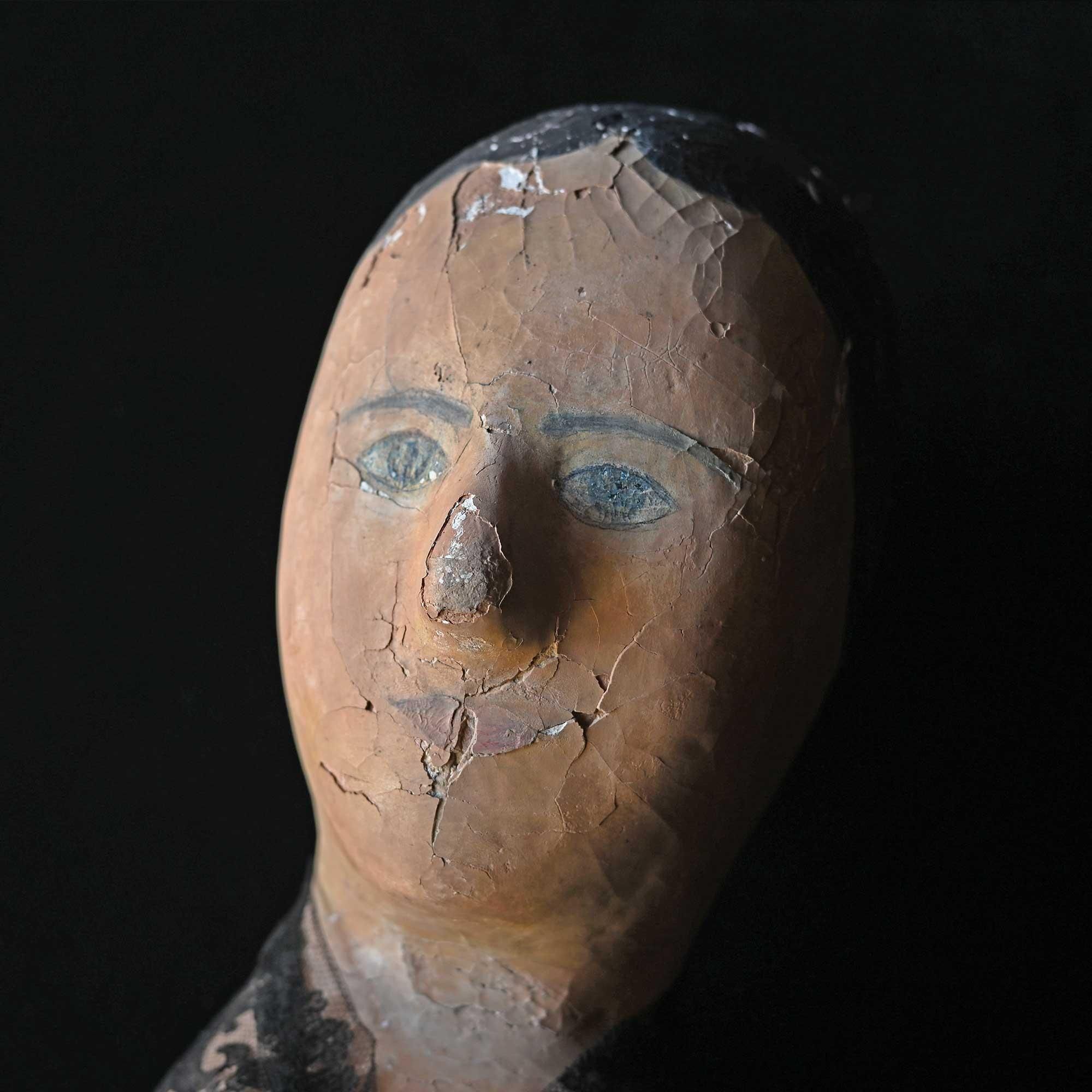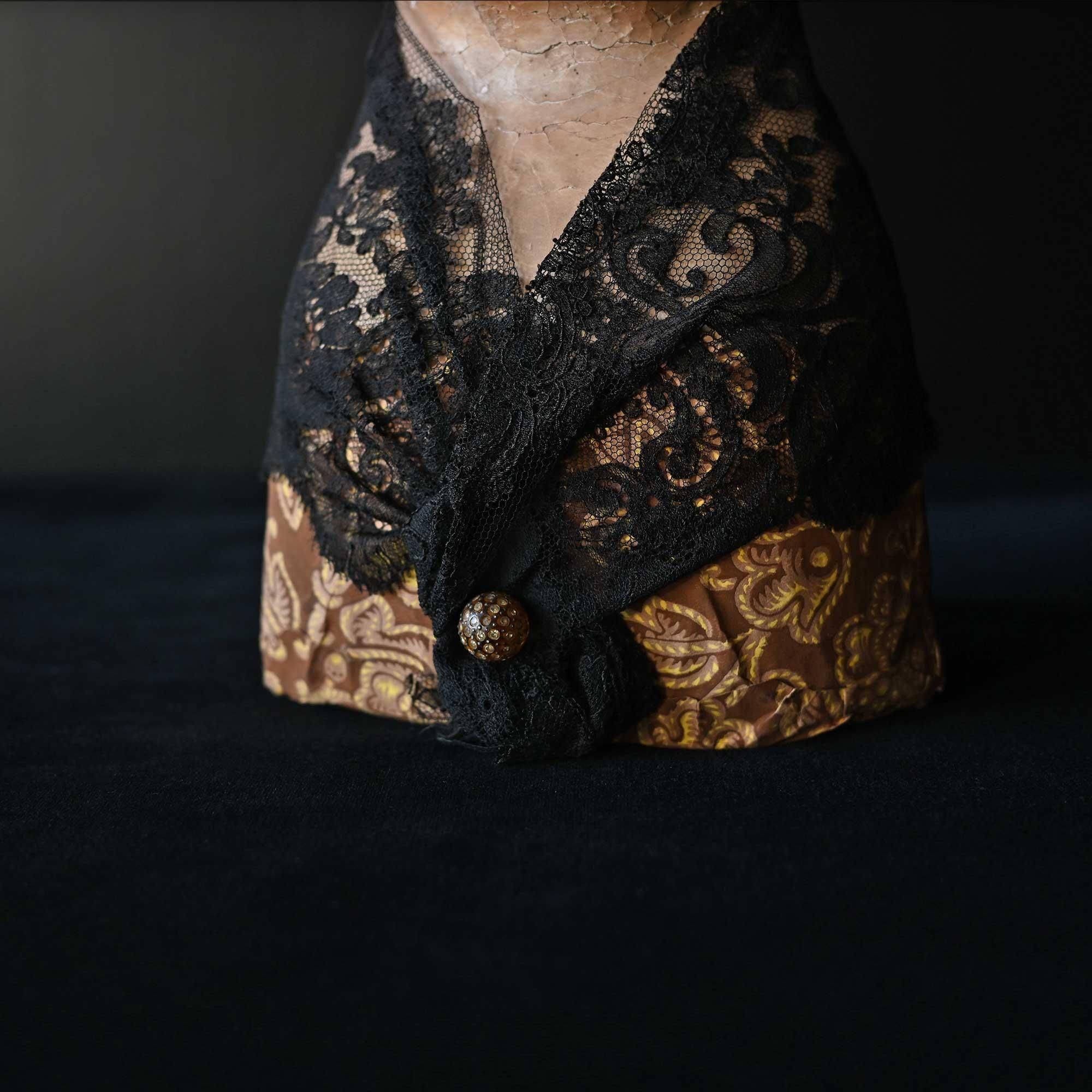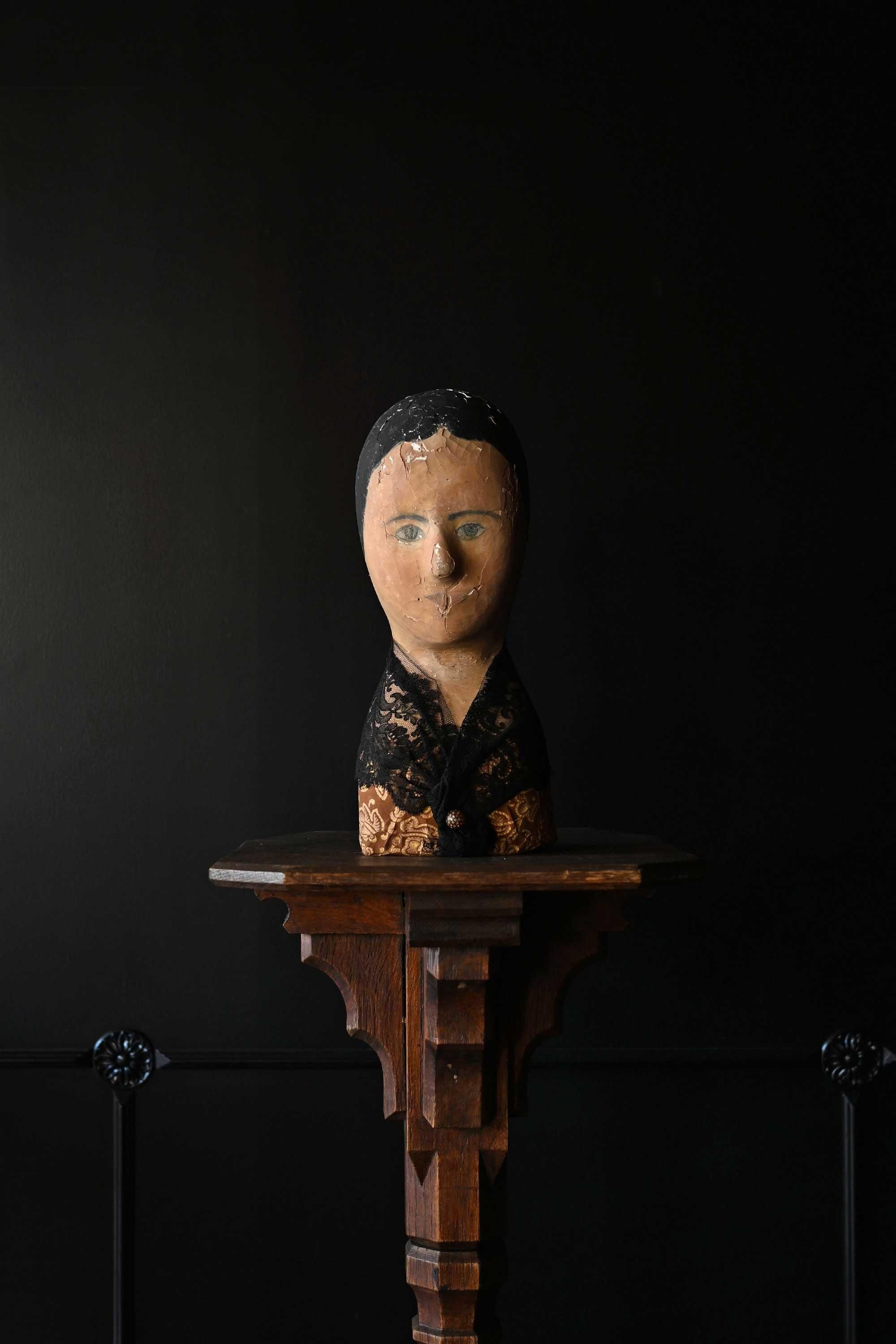 首元にはレースや布があしらわれ、長い年月を経て深みを増した表情と相まって、まるで小さな肖像彫刻のような趣き。
