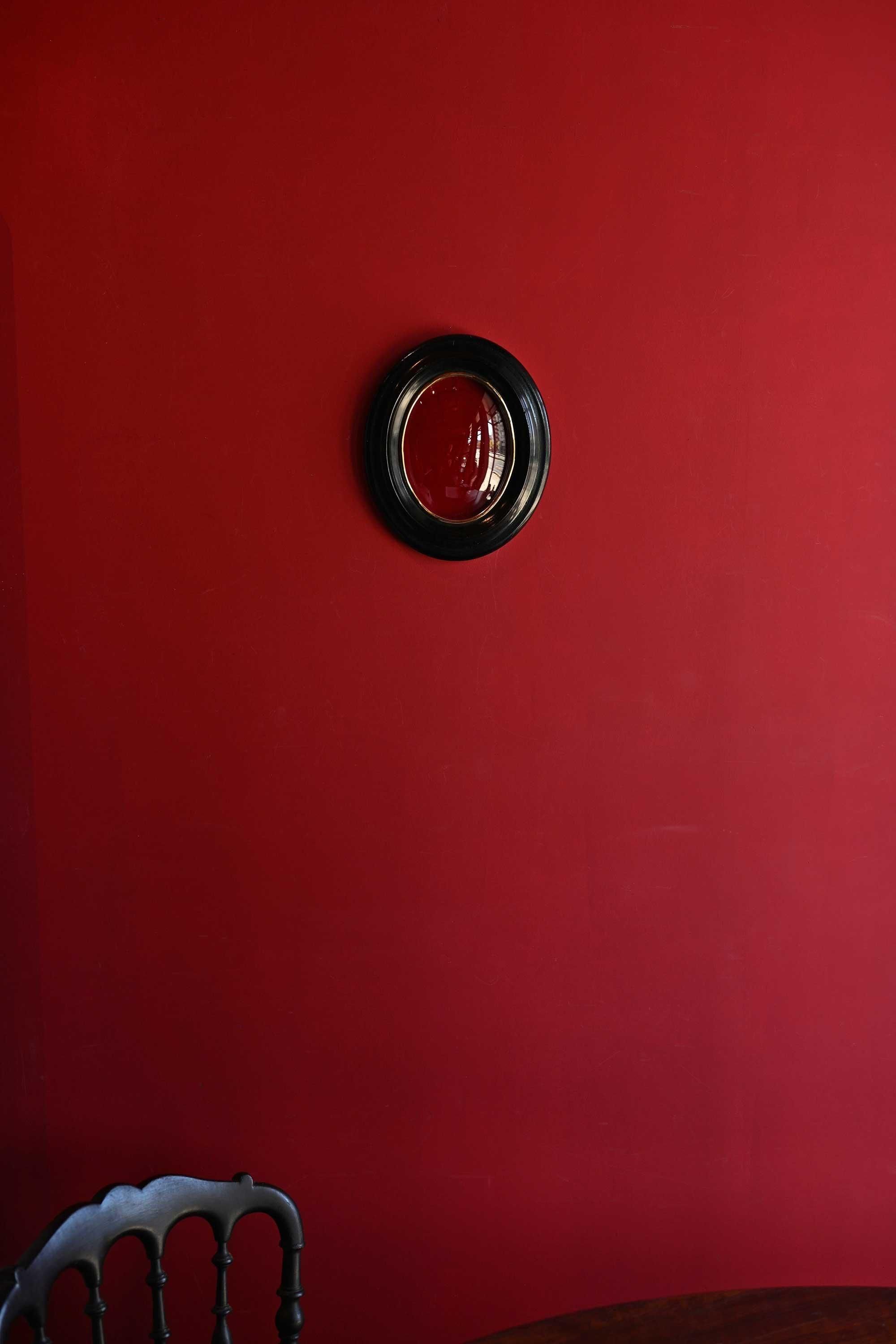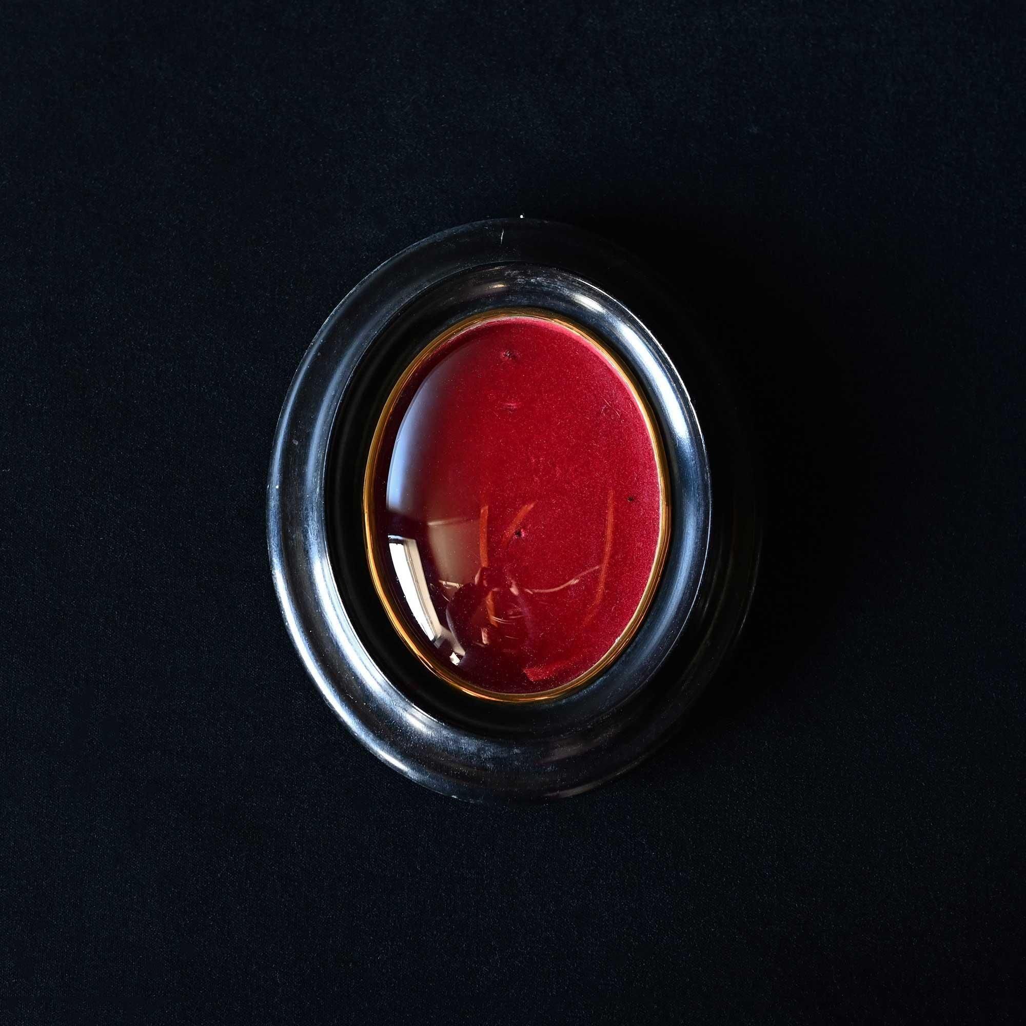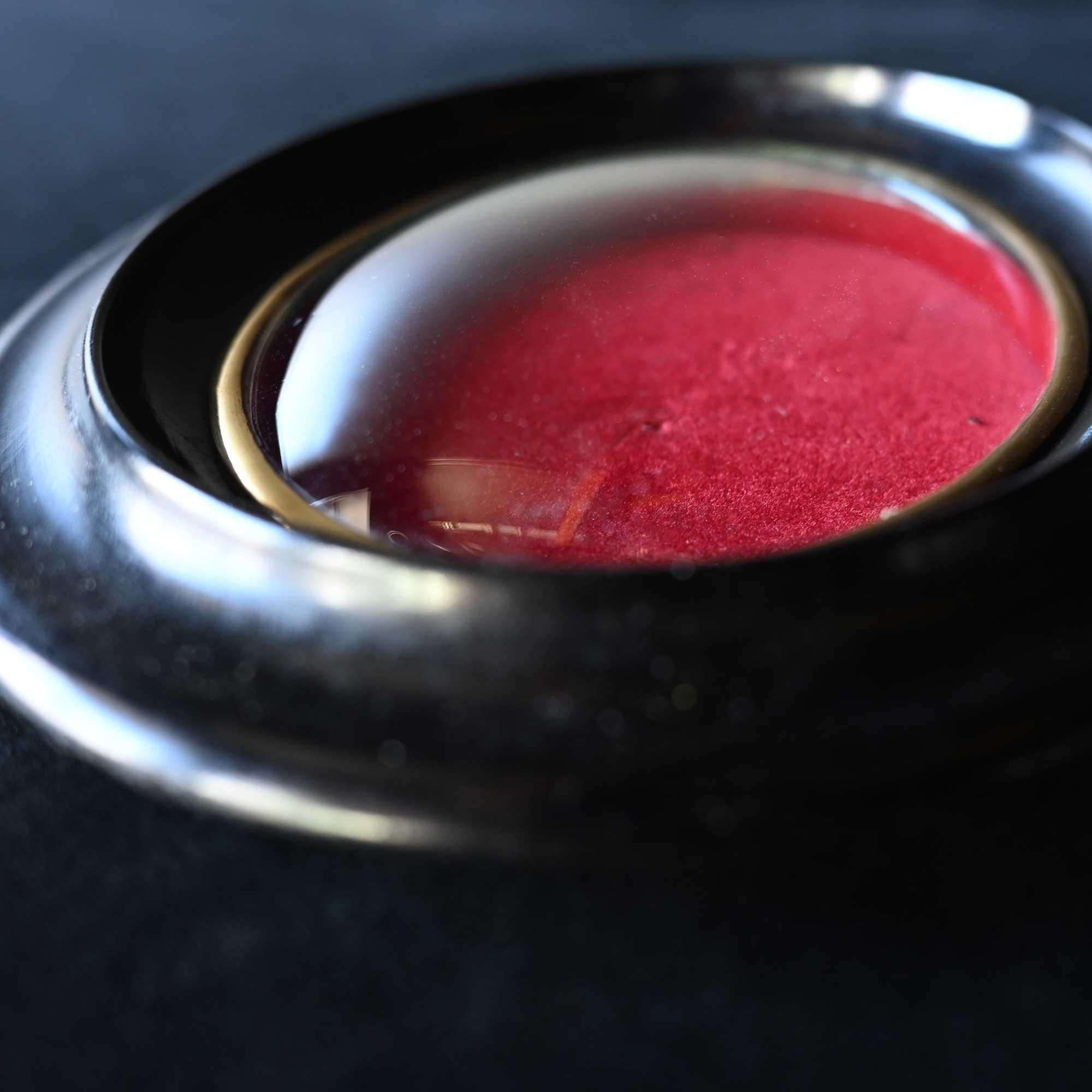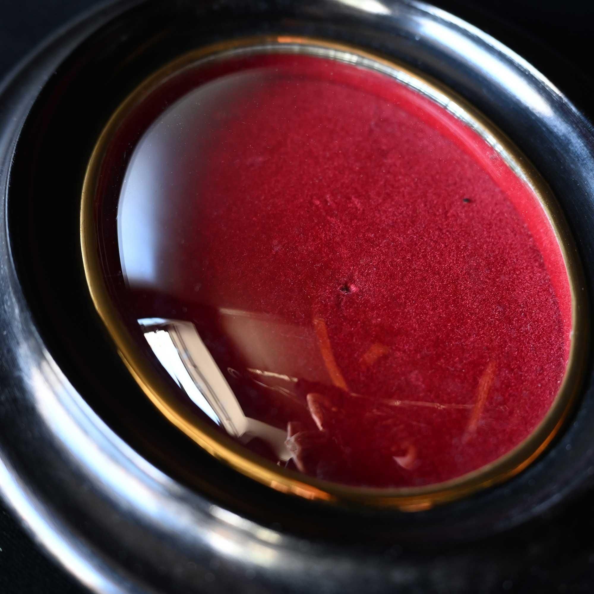 赤いベルベットのような台紙がアクセントとなり、飾るものをよりドラマティックに引き立てます。