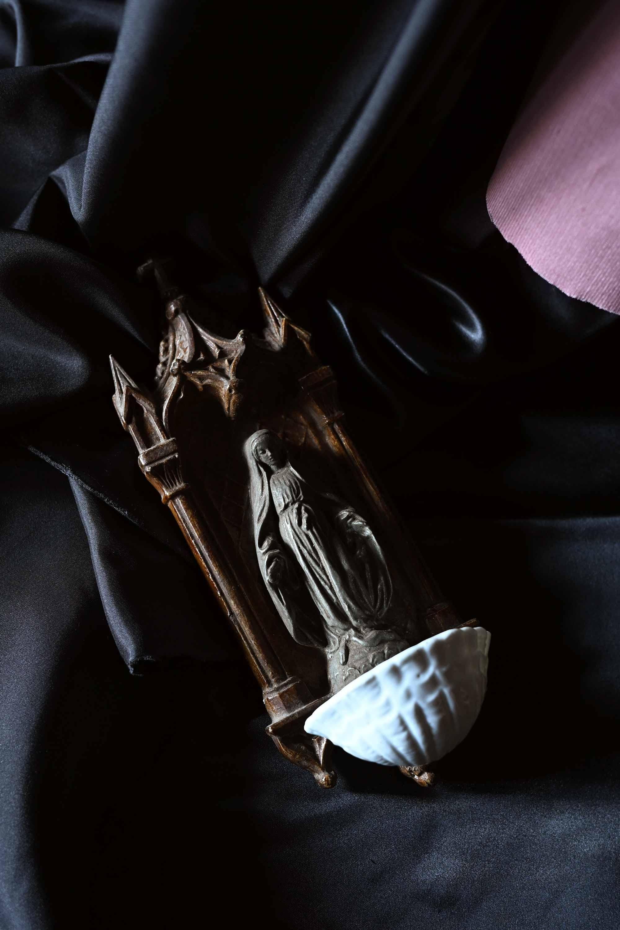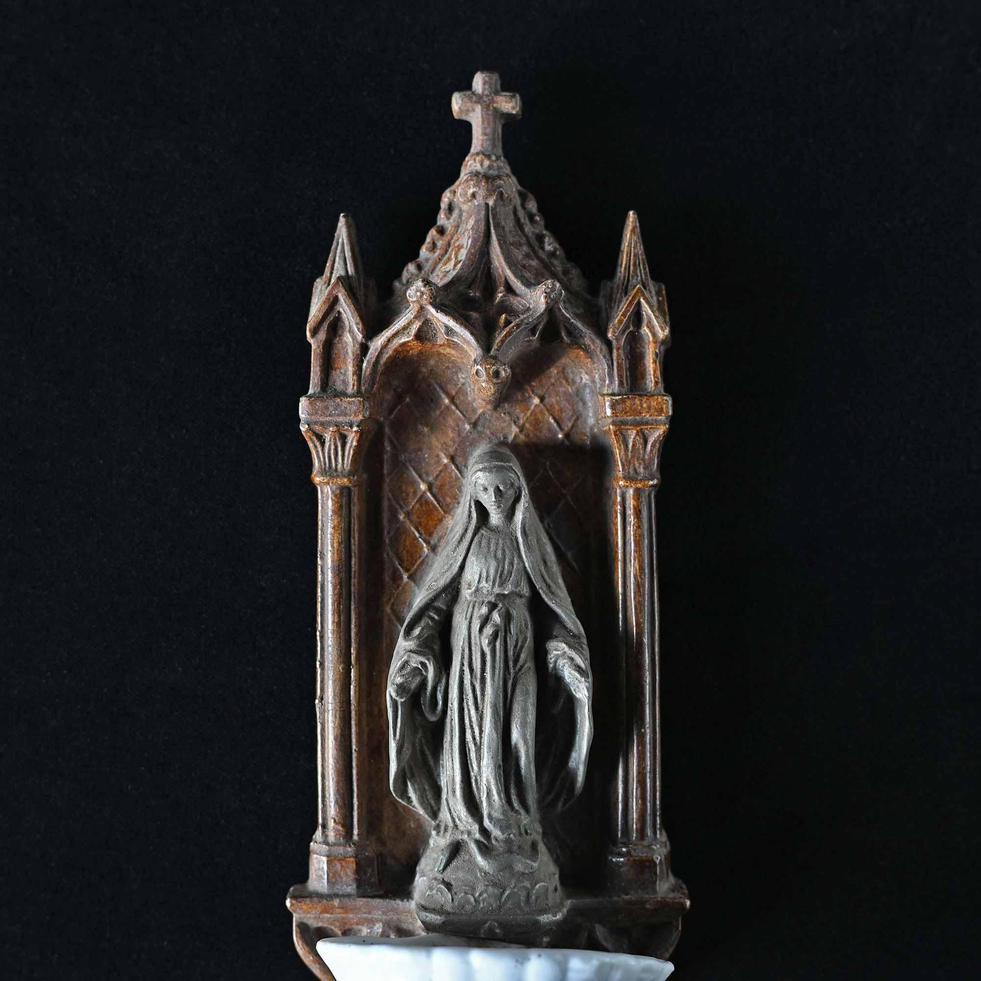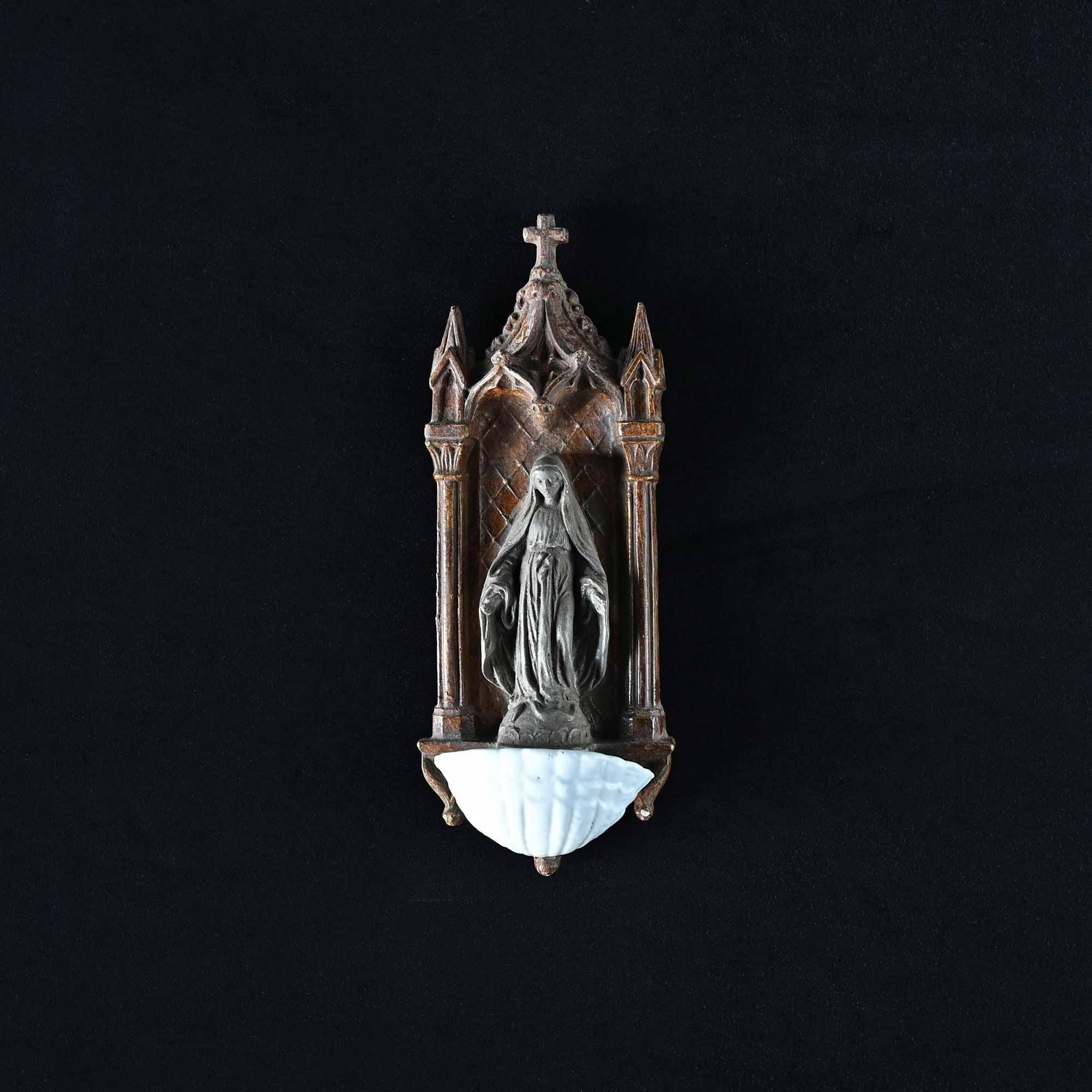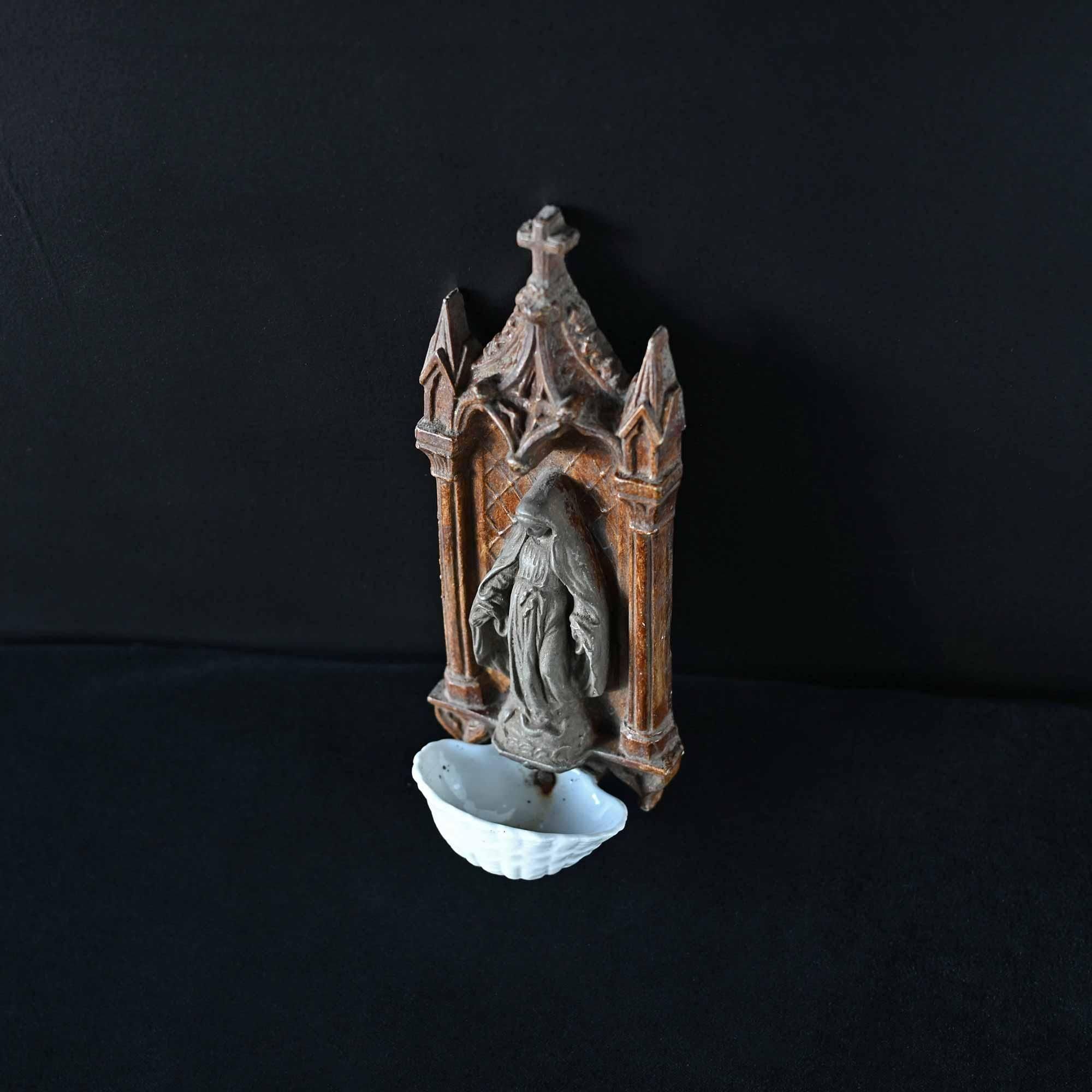 下部には白磁の小さな聖水盤が付属し、祈りの場で用いられてきた壁掛けオブジェです。