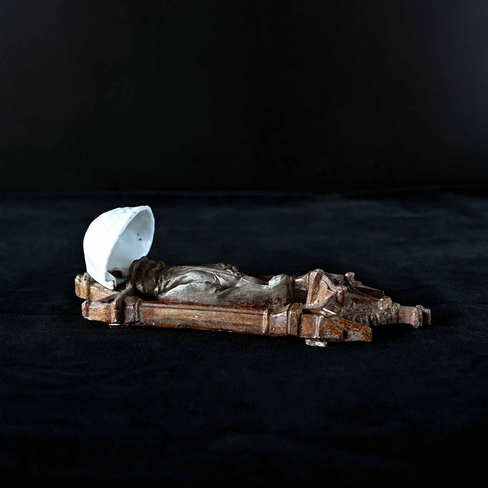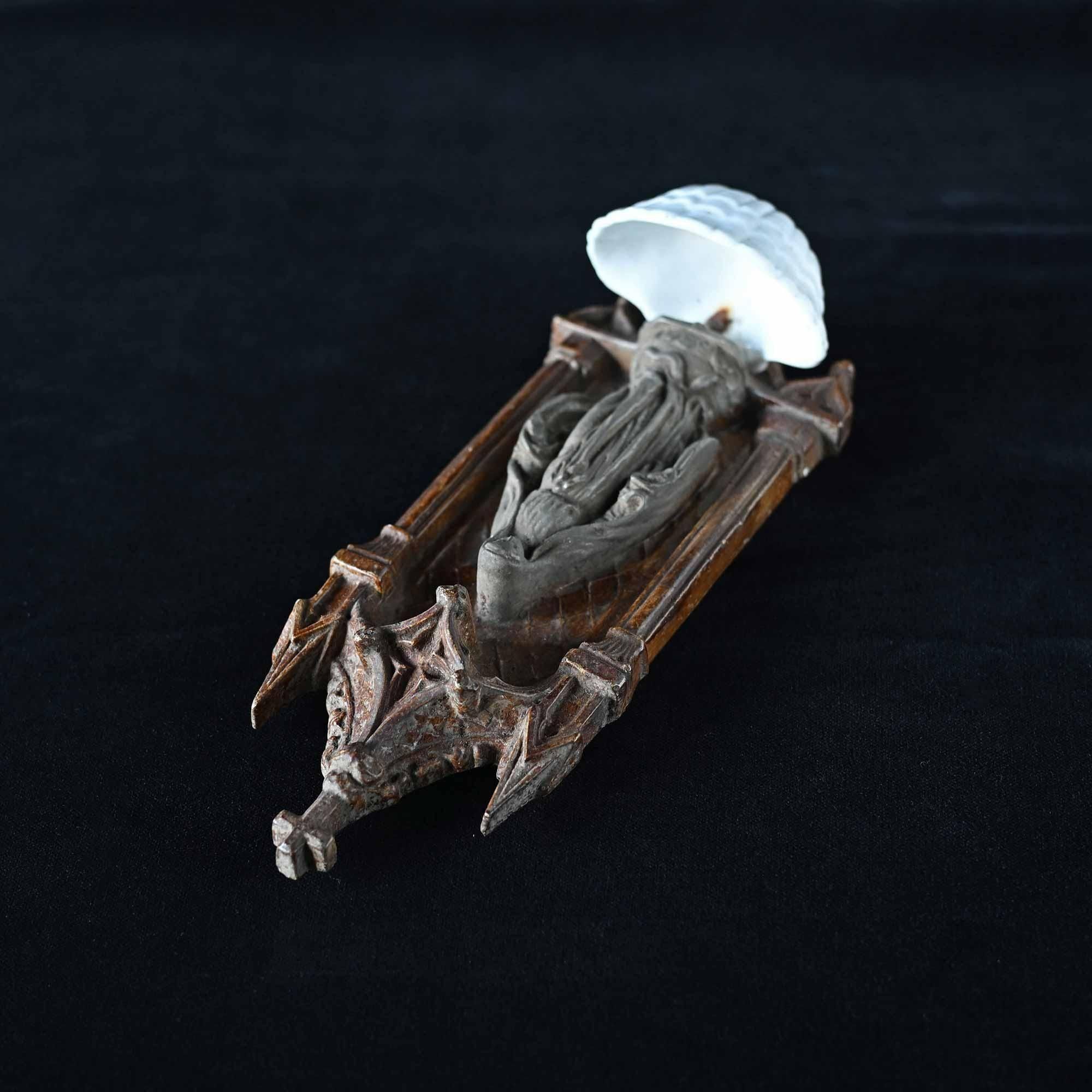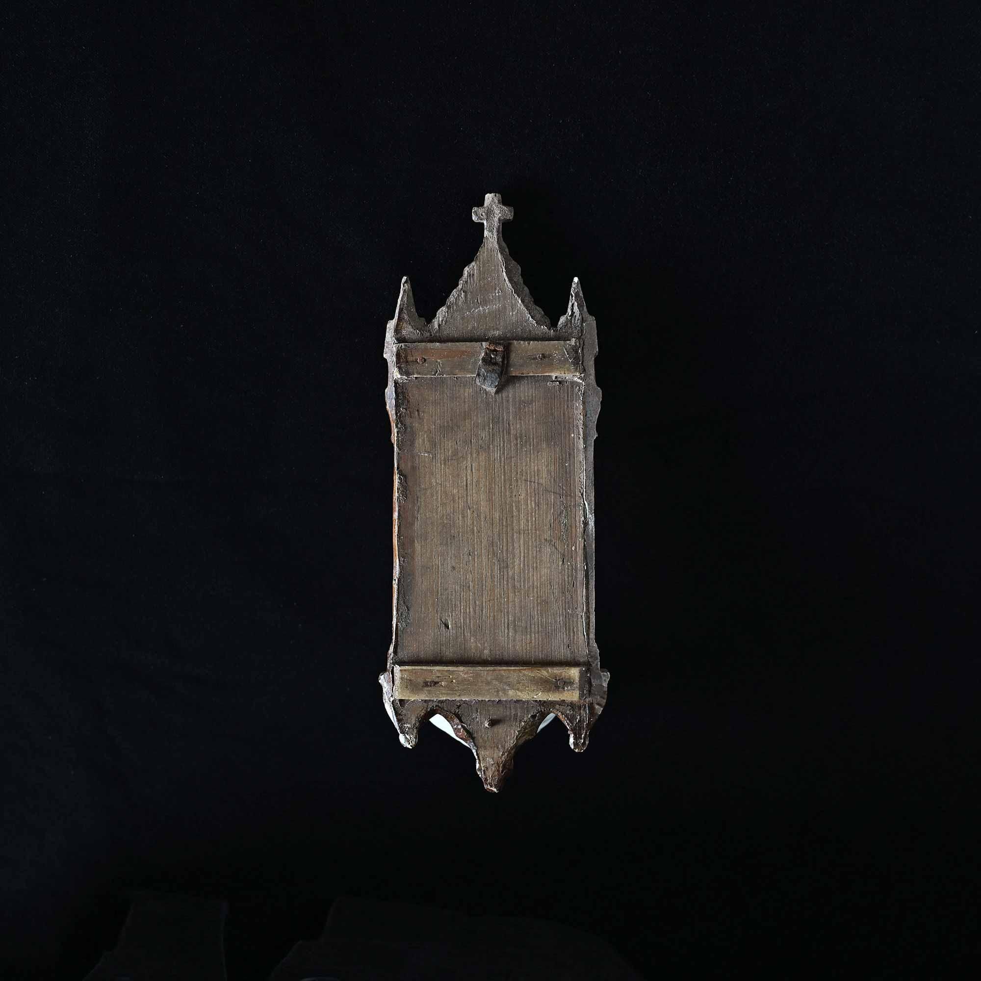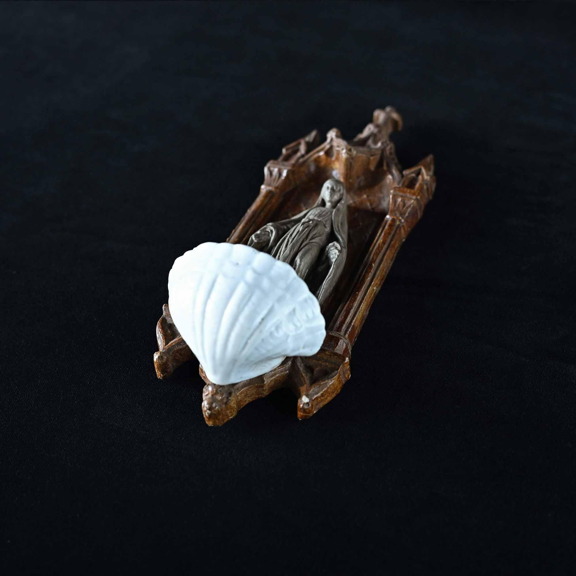 下部には白磁の小さな聖水盤が付属し、祈りの場で用いられてきた壁掛けオブジェです。